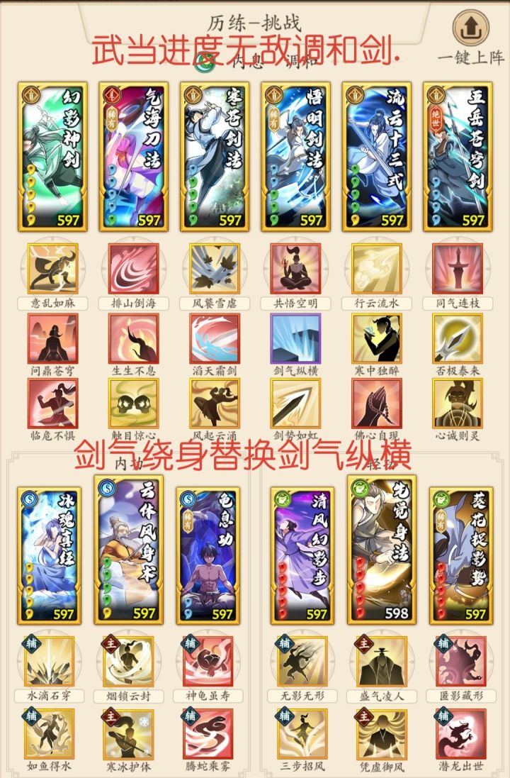 武当进度配招如下:开出剑气绕身的可替换掉剑气纵横有刺乌的玩家可以触目惊心替换刺乌,具体根据区内环境敌方2号3号出手流派多不多而决定如阴拳不多的环境,可大彻大悟/偷天换日替换否极泰来此配招,进可攻退可守 先手后手皆可用,拥有绝对一速的可龟息/冰魂 主运替换云体主运位置波斯进度依然是这个框架,只需要寒中独醉替换为飞沙走石既可#秋白出品#调和剑