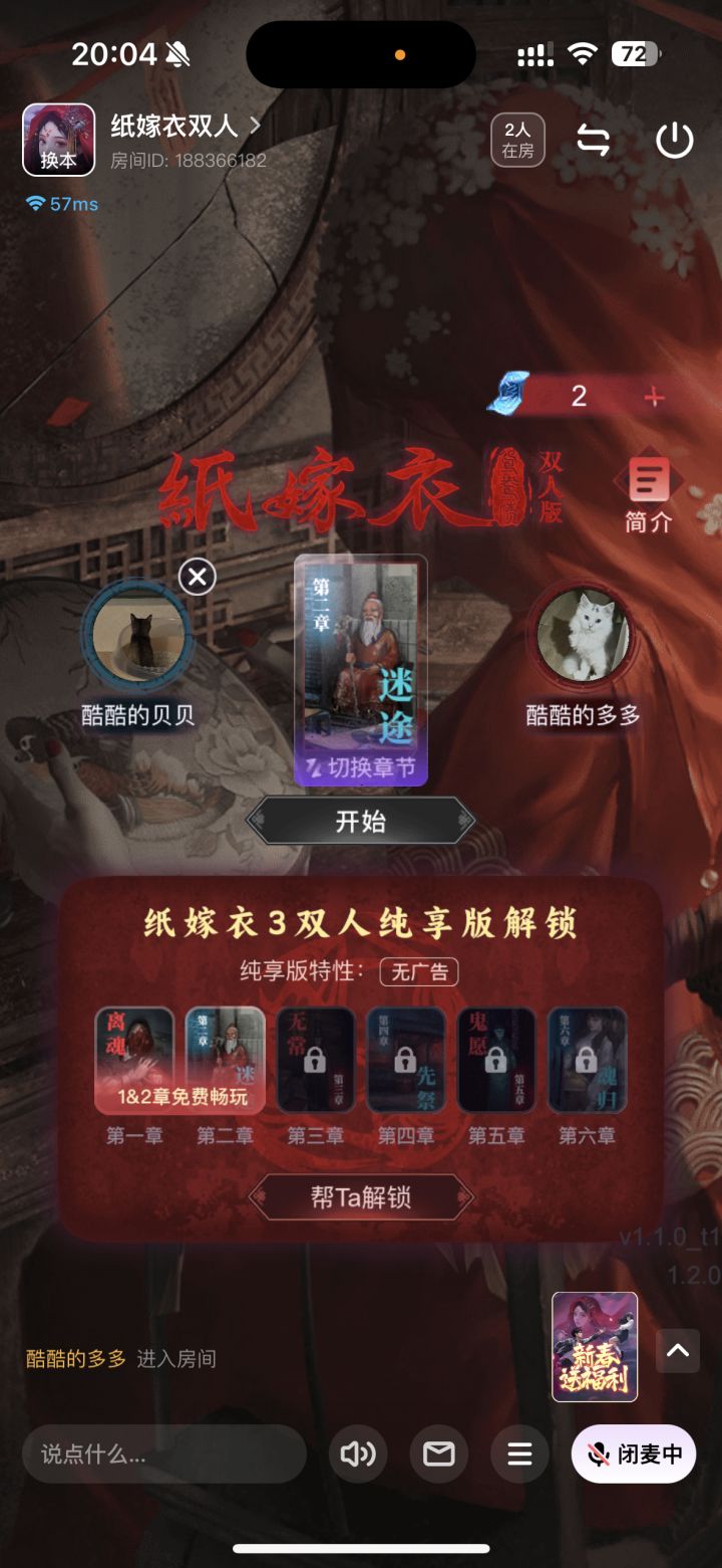 喜欢这种一个APP就有好多好多密室本的APP,还能跟朋友一起玩的,最近刚玩了新上的纸嫁衣双人版,我觉得不错,我朋友差点被贴脸吓到。#谜境纸嫁衣双人版