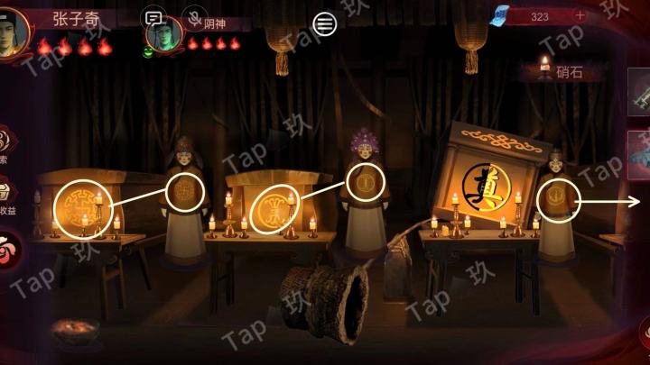 1⃣阳神1-义庄左边房间,拾取桌上的【供品】,将其放到纸人食桌上拾取凳子上的【香】,将其插到纸人食桌上香炉里拾取地上的【纸钱】,将其放进火盆里拾取地上的【短竹竿】2-等待阴神点亮义庄外的灯笼3-义庄外拾取【竹节】【长条石头】【短竹竿】【硝石)4-义庄,把【长条石头]放在地上的凹槽处,【短竹竿×2】合成【长竹竿],等待阴神缠布条在石头上放置【长竹竿】5-根据纸人衣服与棺材上花纹