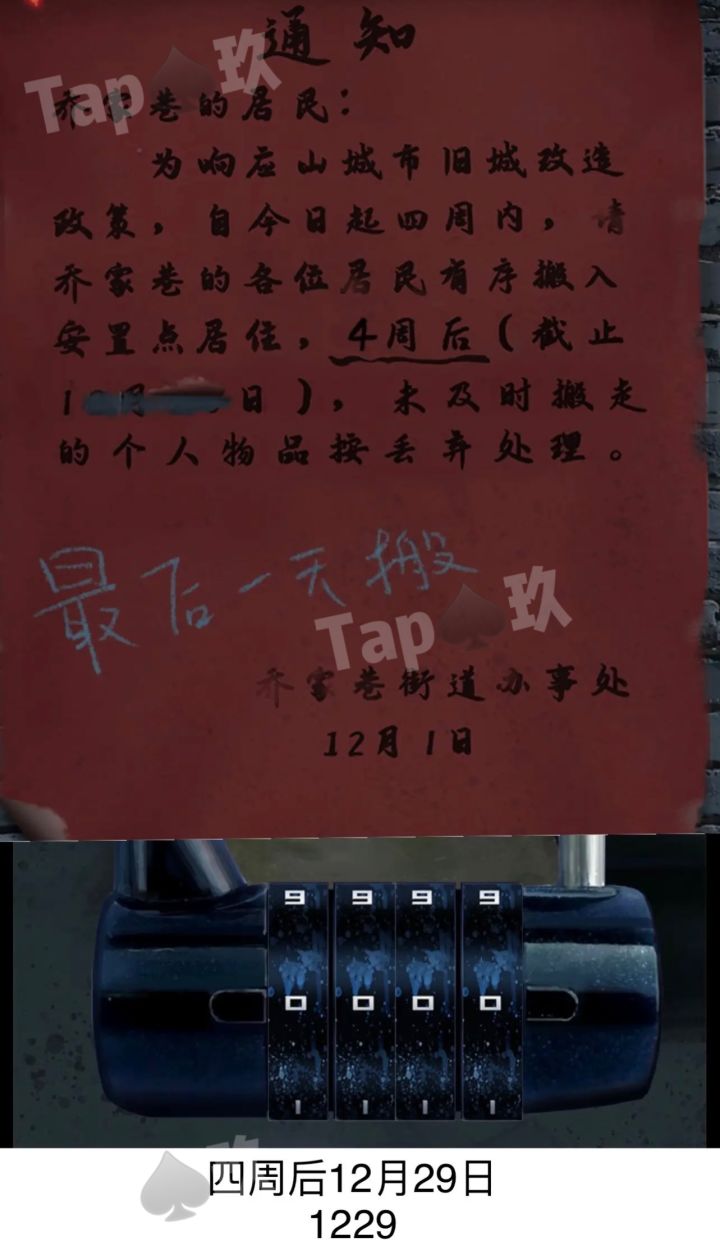 1⃣1-拾取【毛笔】,画符,对着左侧的白锅使用2-进入巷子点击左侧垃圾桶,拾取【木棒】点右前方门口,查看通知,获得线索,通过计算获得密码(1229),点击下方箱子解锁,对着箱子里的铁锤使用【木棒】,获得【羊角锤】,用其打开旁边木门3-房间内点击查看窗户,获得线索(蝴蝶·红),拾取【喷漆罐】对着镜子使用获得线索(花·黄,脚印·蓝)点击查看床头海报,获得线索(乌龟·绿) 点击衣柜,查