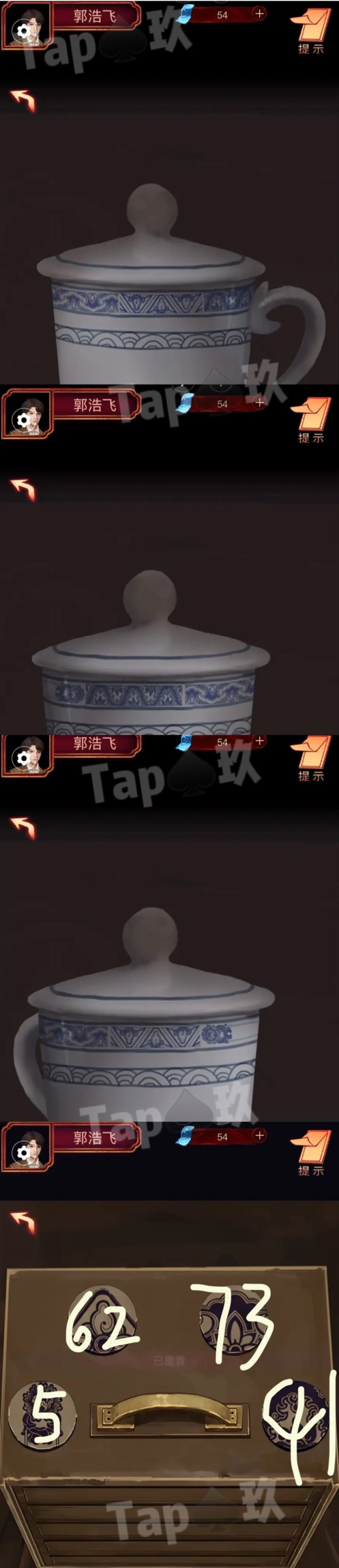 4⃣1-茶楼,点伙计点客人,得知需求点蓝色柜子,获得【竹筐】点帘子,查看书本线索2 -点右下方桌子,观察茶壶茶杯摆放点左侧柜子,获得【空水杯×2】3 -右边场景,点右侧桌子,获得【一壶水】街道,点炭火炉子,放置一壶水,获得【一壶开水】4 -茶馆右边场景,点右侧柜子,查看茶杯花纹(根据把手确定纹理图案逆时针)点中间桌上茶叶箱,花纹从左至右顺序为1234,按顺序点击,打开5- 根