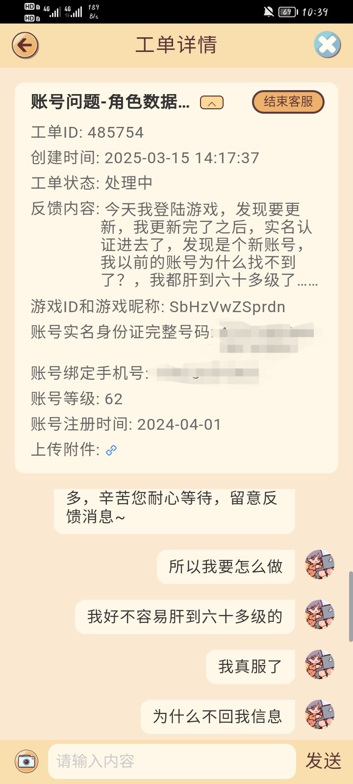 昨天休息,想着上游戏发现要更新,我也没多想,更新完认证之后,发现不是我的账号,是一个新的账号,我的账号呢?我从游戏刚出来就开始玩,一直是一个摆烂玩家,辛辛苦苦肝到六十多级,给我账号清理了?我上面填的注册时间可能有偏差,但是我是在抖音,看到卡琳娜宣传时候在抖音下的,那时候应用商店还没用上线,就这样给我的账号清理?找客服,从昨天到现在一句话不吭,也不解决问题,