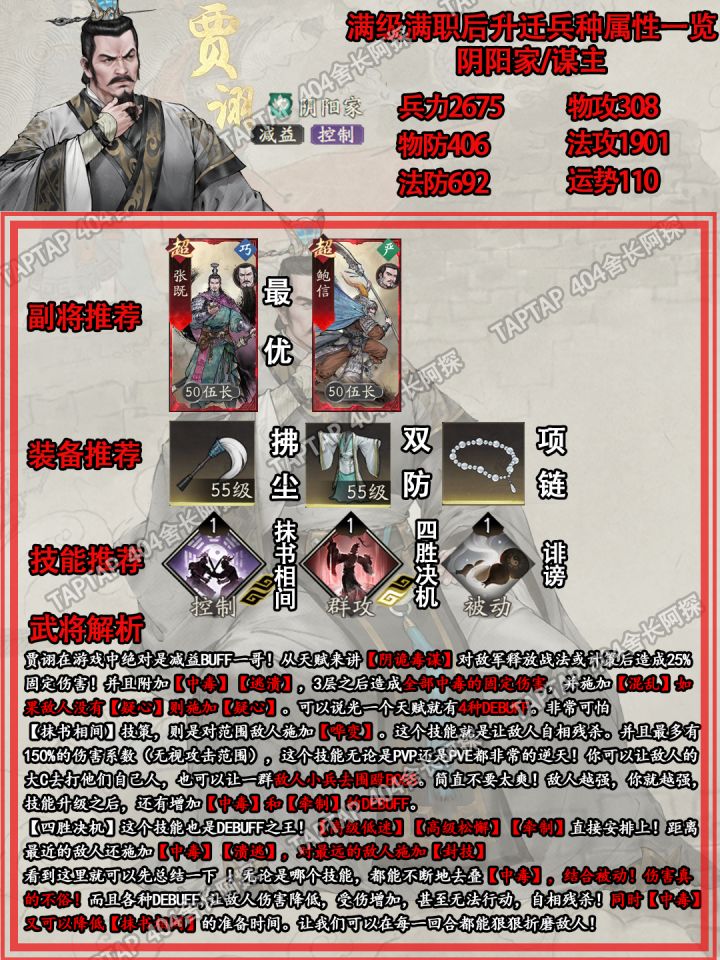 先行总结贾诩同时拥有哗变、定身、混乱、牵制等控制手段,在当前游戏内属控制第一人。自身以中毒+溃逃双dot为主要出伤手段,不十分依赖数值输出,作为新区开荒与推图工具人,集辅助、控制、越级于一体,且低迁即拥有所有功能,升迁仅提升dot输出与自身硬度,是一位“性价比”极高的超主将。一、基础面板分析通过主流策士角色横向对比可知,贾诩在以上角色中:兵力:第1位 谋攻:第2位 谋防:第3位二、天赋分