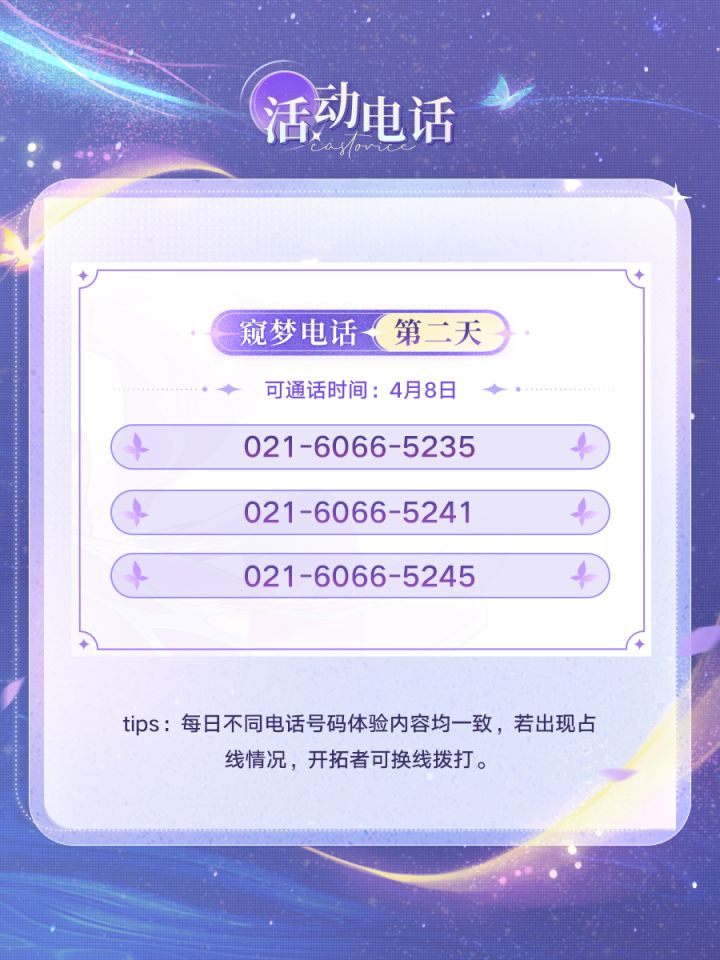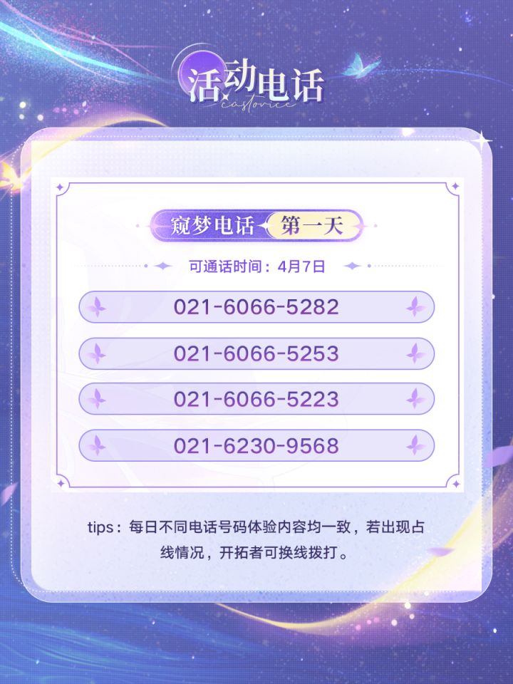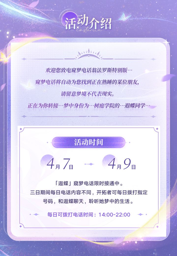 活动时间2025年的4月7日至4月9日每天的14:00——22:00可以根据上面图片的号码进行拨打与遐蝶沟通交流哦,每个手机号只能拨通至多两次,这个很有意义哦,推荐宝子们打开电话录音功能保留这次美好的体验「欢迎您致电窥梦电话翁法罗斯特别版。」 「正在为你转接…梦中身份为…树庭学院的…遐蝶同学…」 「遐蝶」窥梦电话限时接通。活动期间,开拓者可拨打指定电话号码,和遐蝶聊天、聆听她梦中的生活。