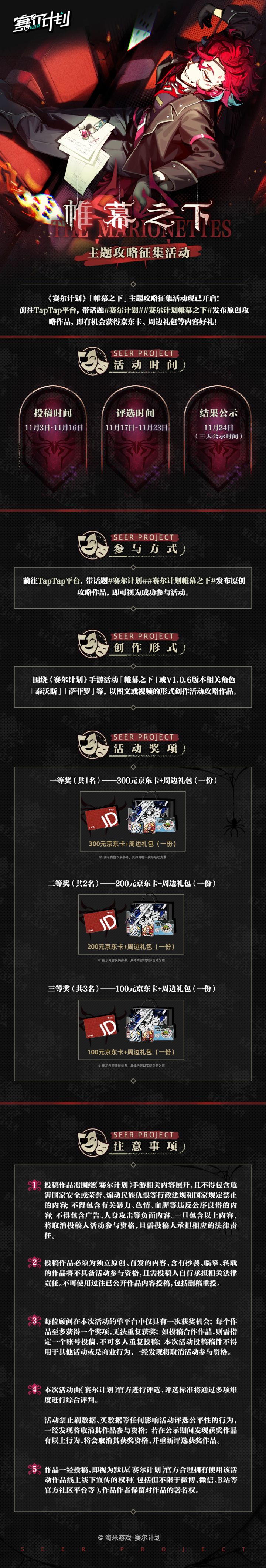 《赛尔计划》「帷幕之下」主题攻略征集活动现已开启!前往TapTap平台,带话题#赛尔计划##赛尔计划帷幕之下#发布原创攻略作品,即有机会获得京东卡、周边礼包等内容好礼!★活动时间:11月3日~11月16日★参与方式:活动时间内,前往TapTap平台,带话题#赛尔计划##赛尔计划帷幕之下#发布原创攻略作品,即可视为成功参与活动。更多活动内容详情,点击下方长图进行查看~------------