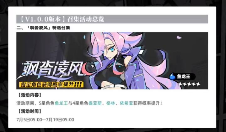 5号开启的鱼龙王up池子,池子里还有3位4星角色陪跑,分别是格林、提亚斯、依希亚,我比较看好的是格林,格林在PVP有着很亮眼的表现,提亚斯和依希亚我只能说未来可期,重点看鱼龙王。鱼龙王是水系辅助角色,1技能单体伤害后概率转移一个buff增益效果给队友,技能天赋强化后效果为2回合。2技能单体伤害后自身提高速度,概率禁强(不能获得强化状态)技能天赋强化后如果禁强成功,全体概率加攻1回合。3技能全
