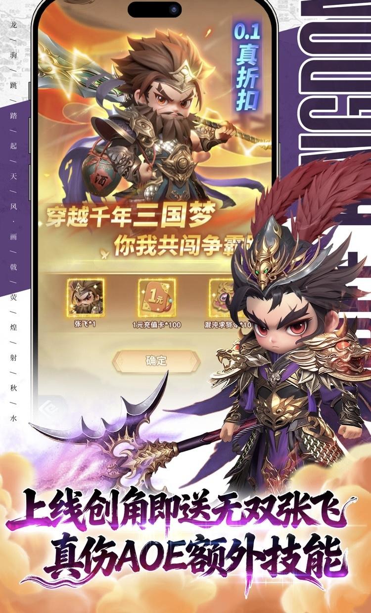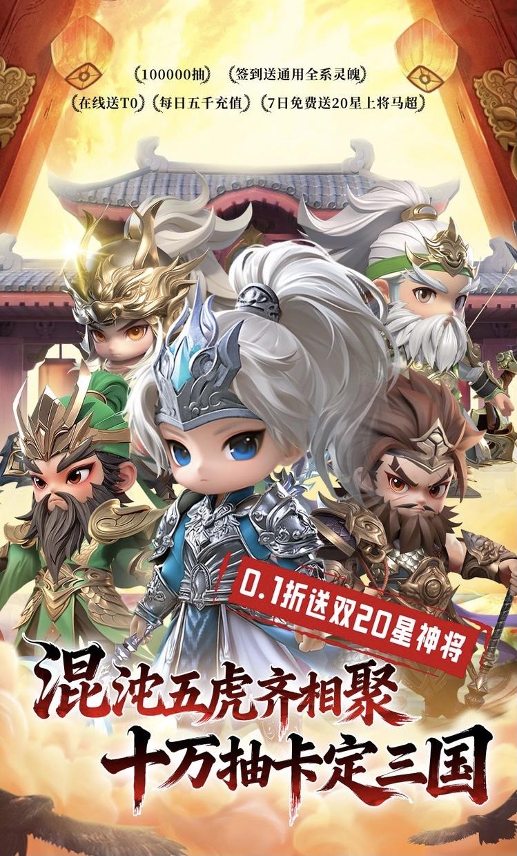 【0.1折版本】648只需6.48! 【100000抽】每日登录免费领取高级求贤令,总计赠送十万抽! 【20星无双】14日登录送20星无双黄忠,本体狗粮全包,免费养成! 【混沌张飞】上线创角即送混沌武将,无双张飞,真伤AOE,额外技能! 【在线送T0】首日在线,送无双英雄,上将黄忠,直送8星! 【7日庆典】7日任务免费送20星上将马超,五虎上将免费得三 【每日五千充值】每日领5000元