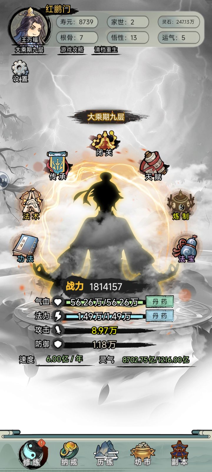 1、飞升我走的鬼仙路线,首先在女鬼剧情选择放她走,然后在副本获得百鬼夜行功法。功法10级且境界达到大乘期,寿命耗尽生效。鬼仙之后寿命变成9999,战力低的可以在这个阶段疯狂堆。2、传承游戏设定的传承和平常的不太一样,也可以理解为成就。目前我一共获得了两个传承,不打算刷了,条件未知不好搞。第一个成就:躺枪天赋全点根骨和悟性,气运和家世都别点,选择天赋也注意不要点到,然后概率会刷到,一岁出