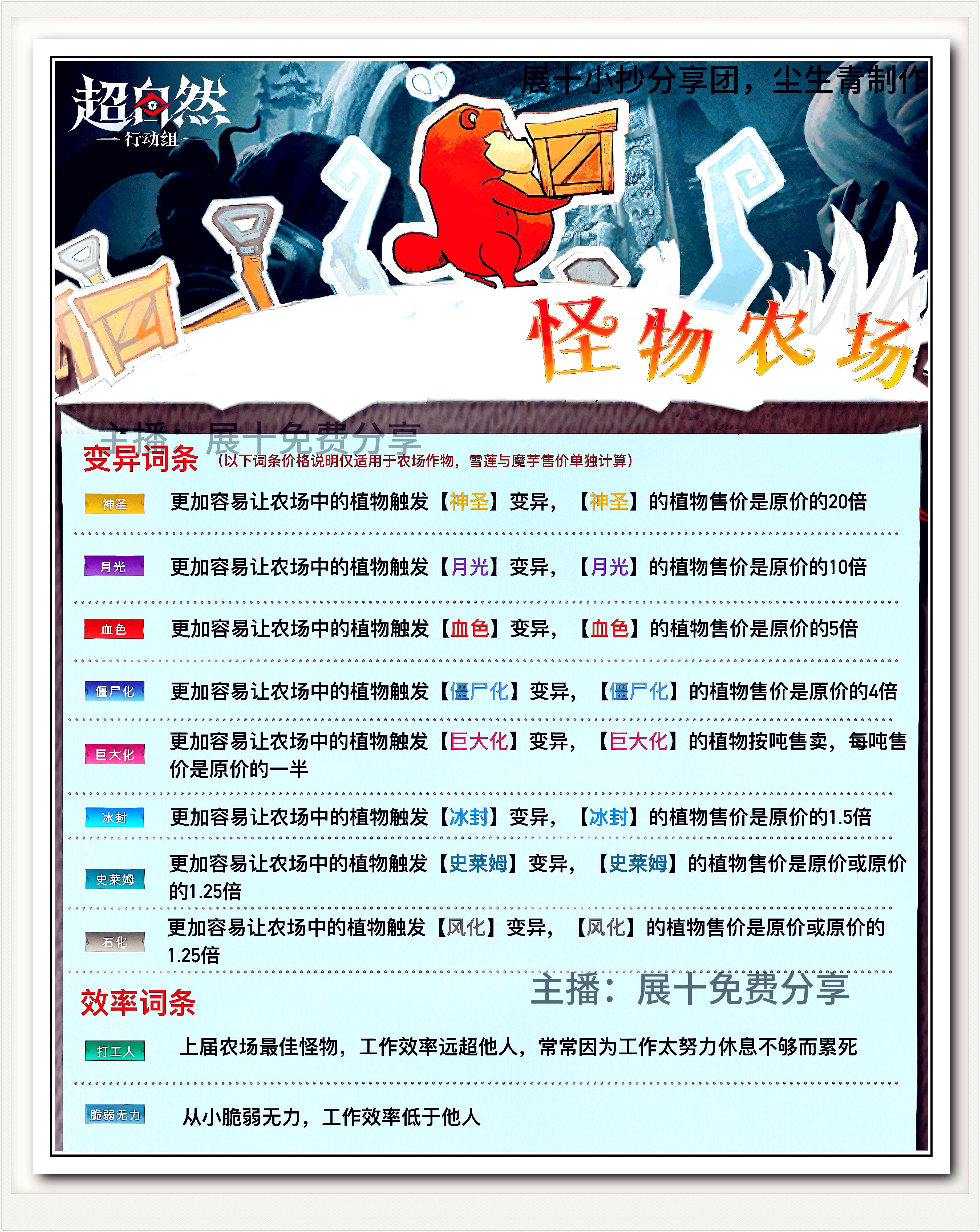 超自然怪物农场 不同的词条对农场植物的售价影响都不一样,神圣17倍,月光10倍,血色5倍,僵尸4倍,巨大化1.5到5倍浮动按吨卖,冰封1.5倍,石化和史莱姆预计都是1.25倍,但是雪莲和魔芋石化和史莱姆后价格是亏损的。 对农场怪物推荐的最佳词条是神圣+脆弱无力,神圣可以增加植物售价,脆弱无力让怪物不那么卷,可以活就一些。 超自然地图小抄大全 https://v.wkbrowser.com/s/