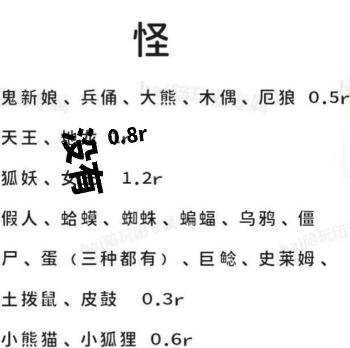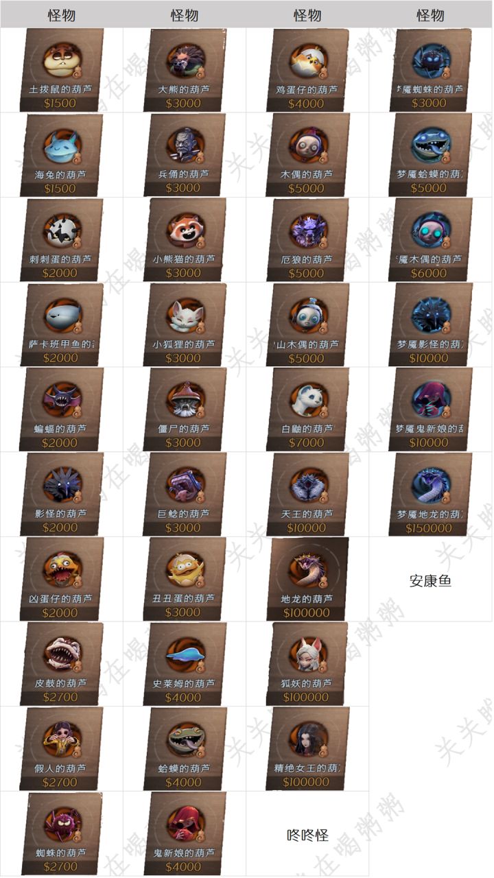 第一梯次(150000~100000)梦魇地龙:150000地龙:100000 精绝女王:100000 狐妖:100000秦帝/少帝:100000 真天王:100000第二梯次(5000~10000)天王:10000 梦魇鬼新娘:10000 梦魇影怪:10000白鼬:7000 财神土拨鼠:6888梦魇木偶/梦魇雪山木偶:6000 厄狼:5000 木偶/雪山木偶:5000 梦魇蛤蟆: