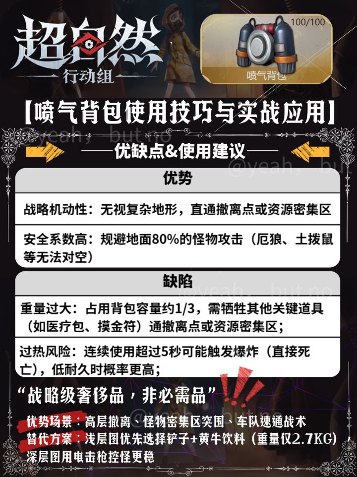 Hola todos, soy Yeah, but no今天带来《超自然行动组》装备攻略之——喷气背包~基础属性与定位重量:22.50KG(全游戏最重道具之一);耐久:100/100(可反复维修使用);功能:提供垂直升空与短距离滑翔能力,允许玩家宝宝跨越地形障碍或者抵达高处;~战术价值撤离辅助:快速飞至车顶提交古董或躲避地面怪物(如厄狼、鬼新