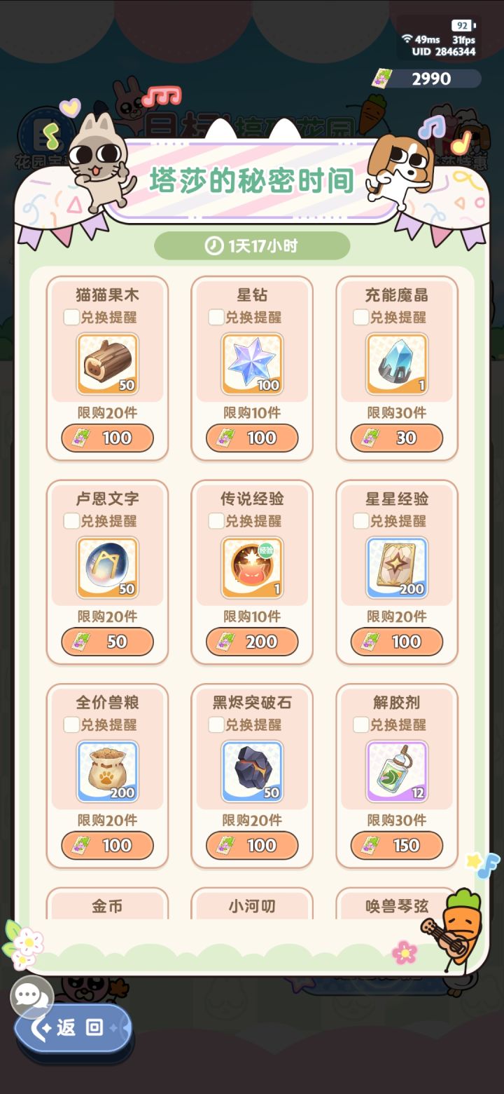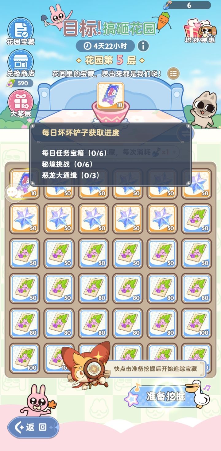 先简单介绍一下活动奖励机制:每一层有36个格子可以铲,一般层15铲保底进下一层,大奖层18铲保底(5、10、15之类的整数层)进下一层。 0氪每天可白嫖的铲子数:日常15+每日免费购买12,7天共获得189铲,钻石一次性购买可得20铲。 再科普一下常规玩法思路:根据活动机制,如果每一层都出保底,所有层出梯子就直接进下一层,拿完第10层的大奖需要15*8+18*2=156铲,在不花钻石购买铲子的情