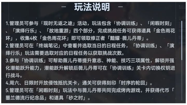 #归路余声版本攻略##趣味玩法##游戏攻略 #黯耀·薇儿丹蒂获取攻略活动#现时无返之途,演绎行乐 前言:现时无返之途,此活动为常驻肝黯曜·薇儿丹蒂活动,管理员等级≥35级即可进行该活动。而其中完成演绎行乐20关后可获得一个金色雨花环,完成薇儿本体任务进度四分之一。另外关于此活动,只有在旧时墨兰德商店清空道具后,各个任务完成才会关闭此活动入口:目前两种入口。 1