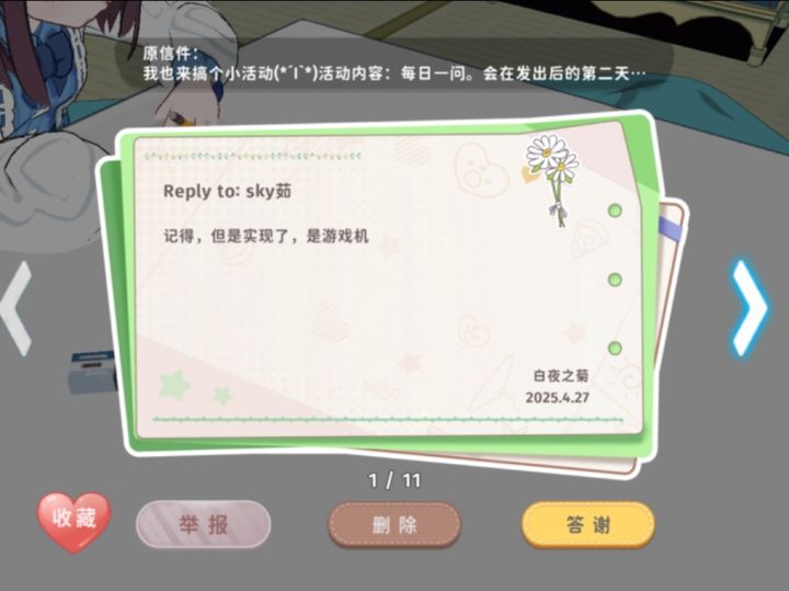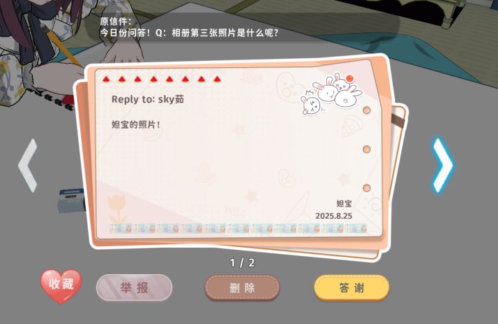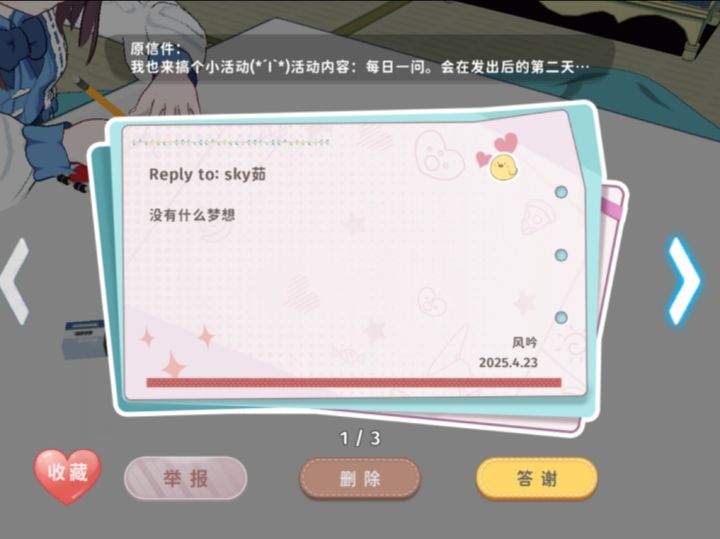 收到了以上三人的回信!虽然LinTian宝子应该是互贴,不过能收到回复我就很开心啦!P2说的妲宝我不太清楚是哪位角色,不过听起来是很美丽的女生哦墨染的回复很有意思呢,不过我不看你的相册啦!之后还会不定期发送这样的小问题,还请多多回信哦!#胡桃日记 #趣味问答 #活动