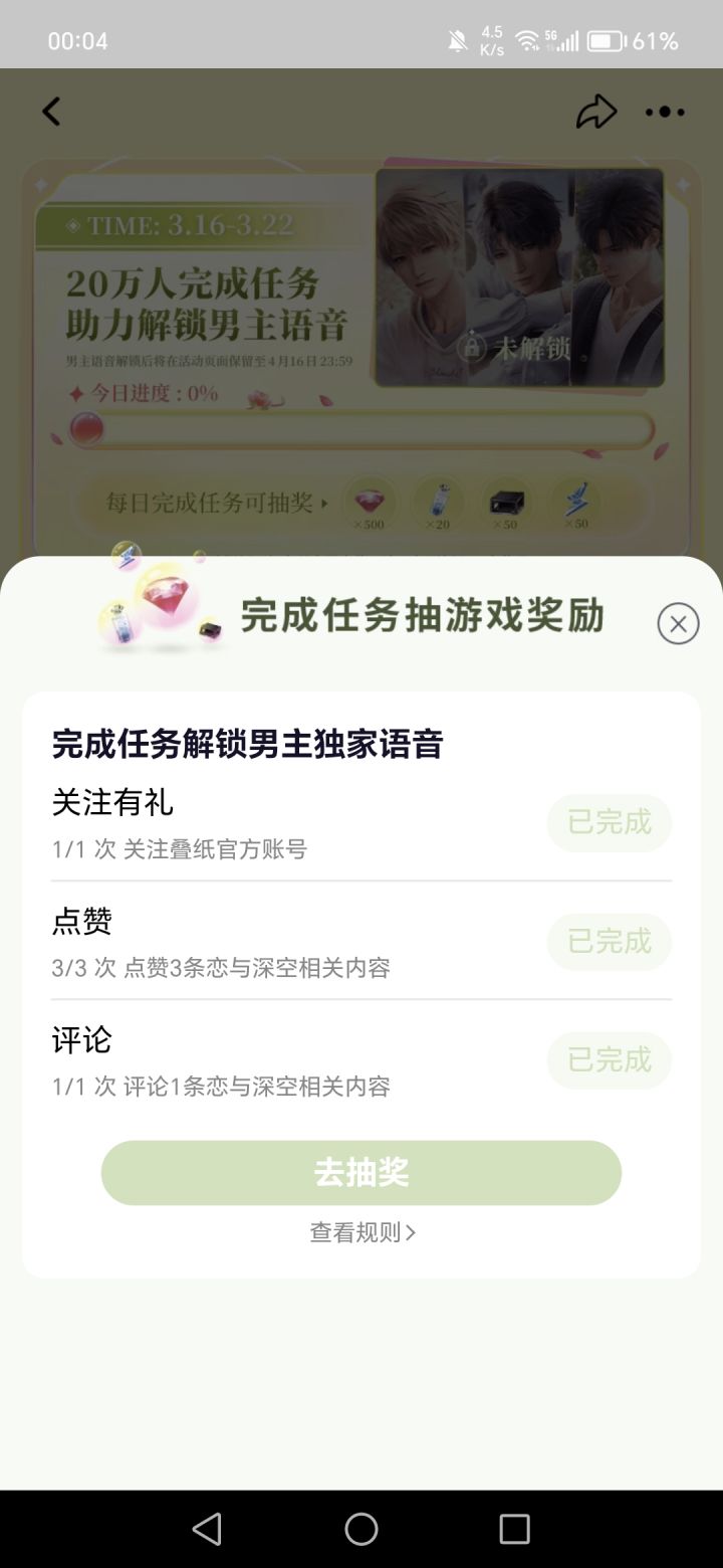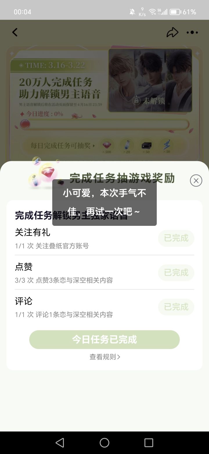 时间3月16日00:00~3月22日23:59:59地点:淘,宝任务也是比较简单,有感兴趣的可以去参加一下,需要抽奖的兑换码。通知:由于过多人参加活动,现在1点16分,已经有人卡住,关注不了,完成不了任务。已经问过客服,建议换时间参加。请耐心一下。#攻略#恋与深空#踏春季活动