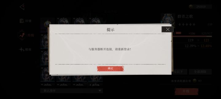 #辉烬首发服务器爆 不管是三星还是四星以及五星的,一键升级只能升到19级,一往20级升就断连,别的都好好的,麻了。反倒是我同桌是正常的,但等下午一过就进不去游戏了,一打开就黑屏,然后就给他踢出来了,我现在除了武器升不到20级,其他的反倒还正常