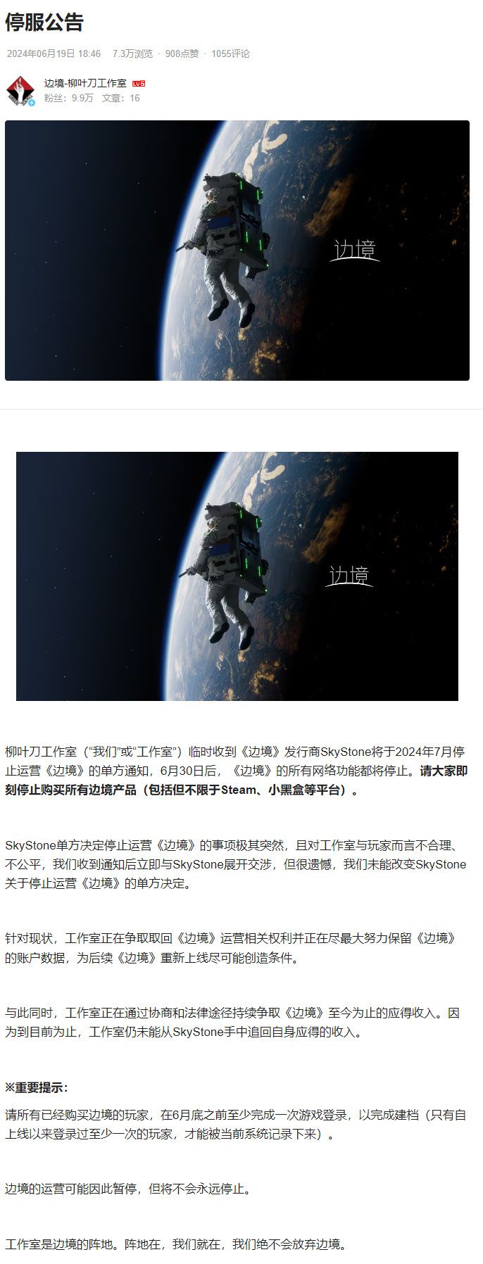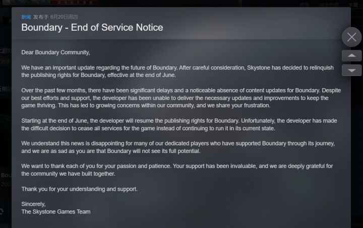 国产游戏《边境》开发商发布停服公告!