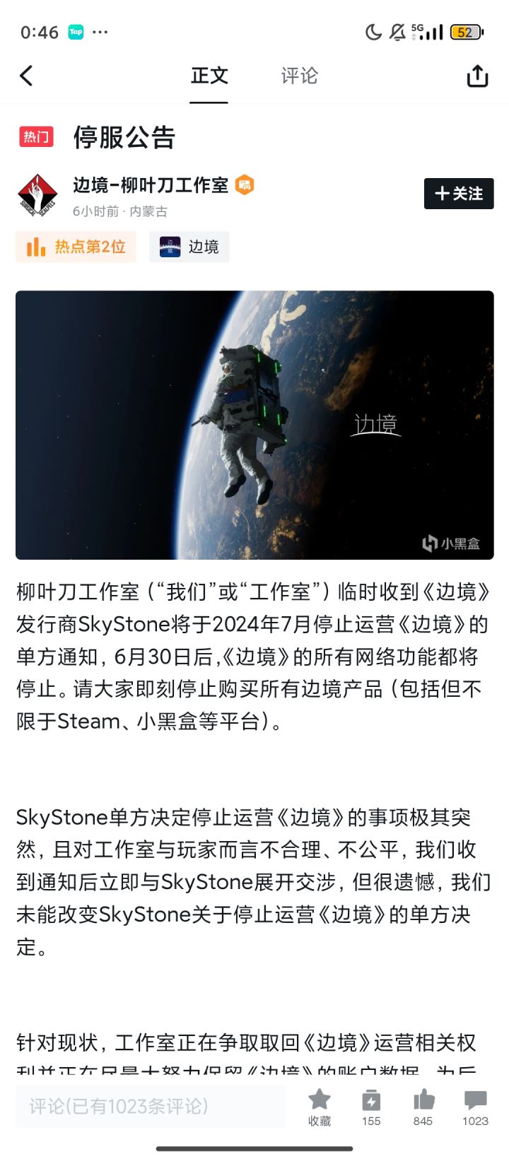 《边境》作为一款国产近未来太空题材的第一人称射击游戏,于2023年在PC上推出。当时此游戏的热度不知道大家还记得吗?然而,近日柳叶刀工作室宣布,他们收到了发行商SkyStone将于7月停止运营《边境》的通知。😢柳叶刀工作室表示,6月30日后《边境》的所有网络功能都将停止。这个单方面的决定让工作室和玩家都感到非常突然和不公平。尽管工作室与SkyStone进行了交涉,但未能改变结果。为了避免不必要的