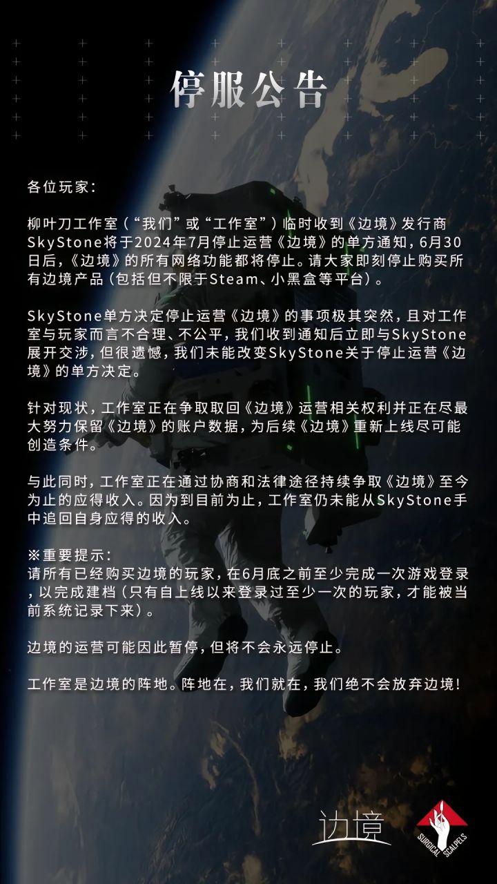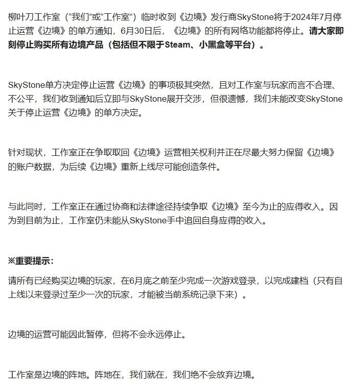 国产射击游戏《边境》开发商“柳叶刀工作室”发布停服公告,公告中称:“柳叶刀工作室临时收到《边境》发行商SkyStone将于2024年7月停止运营《边境》的单方通知,6月30日后,《边境》的所有网络功能都将停止。请大家即刻停止购买所有边境产品(包括但不限于Steam、小黑盒等平台)。”柳叶刀工作室表示通过法律途径争取取回《边境》运营相关权利并正在尽最大努力保留《边境》的账户数据,为后续《边境》重