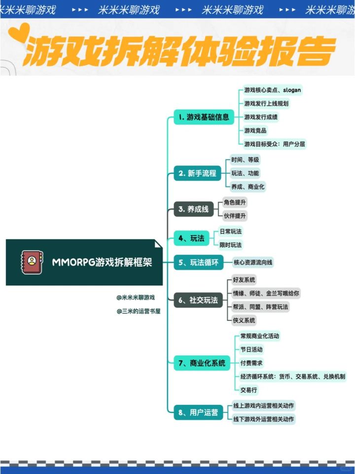 认真的写上至少1篇你所熟悉的游戏拆解报告,可能会成为你的敲门砖。虽然大家也都会准备。但是对于完全玩家视角的小伙伴来说,转变运营策划角度分析游戏还是对求职有巨大的帮助。拆解架构分层:✅1.游戏基础信息:产品的竞品、定位、目标用户、发行成绩,让你从概貌先了解一款游戏的“江湖地位”。✅2.新手流程:新手流程影响游戏的次留,作为运营调优产品,还是单独去做分析和拆解的。留不住用户就别提后续充值了好