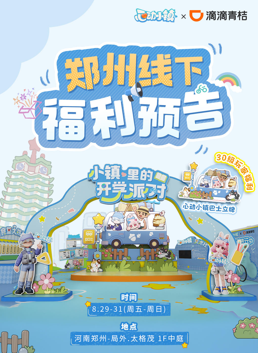 小镇发展家集合啦! 🎈这个开学季,心动小镇和滴滴青桔单车 梦幻联动,线下狂欢开启~ 🌟【郑州快闪打卡】🌟 📅 时间:2025年8月29日-31日 📍 地点:河南·郑州 龙子湖大学城 局外·太格茂 1F中庭 ✅ 四大社团玩法:美术社填色、食堂接菜挑战、骑行抽抽乐、学生证拍照打卡 ✅ 集满3个章即可参与小风车抽奖,100%有礼! ✅ 每日舞台表演:音乐社学姐驻唱~ ✅ 30级玩家专属福利台,限