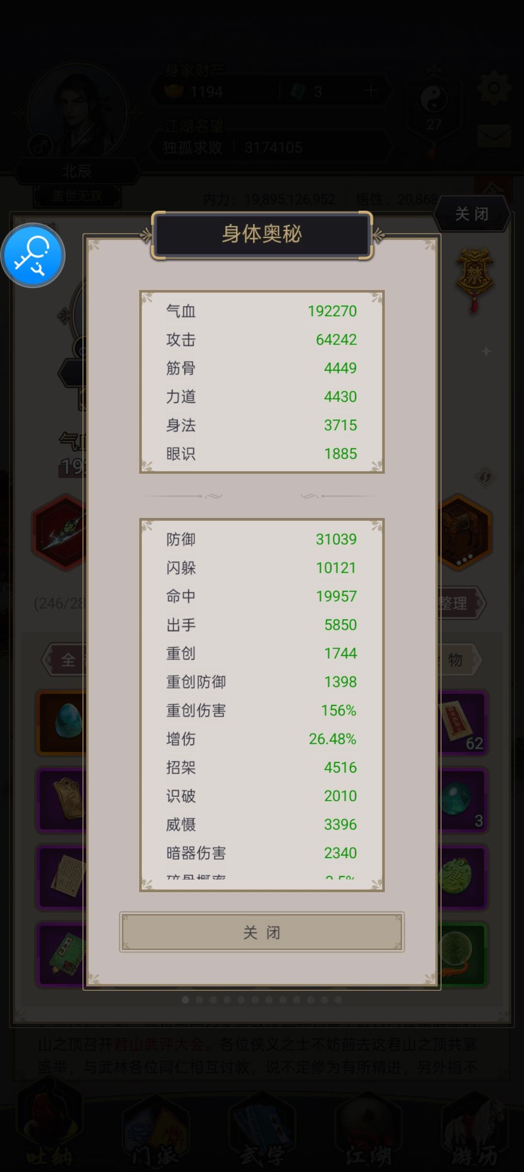 江湖重生之剑修 无丹田125篇 6.24建号 8.6七星 9.17十二坞 10.1武墓 蛐蛐125沉淀不到半个月 赶在大活动突破丹田前拿下[表情_开心] 基础配置: 属性如图 54剑破 全职业御敌不超15 无丹田代表着没地龙所以暗器选的天机 门派阵法4级 腿弟子出招40左右4红尘2书房1自创 剑棍枪弟子均满挡刀 技能组 主动技能 8星:双翼燎云 残阳融雪 流影灼华 无影归踪 飞鸾幽踪 幽
