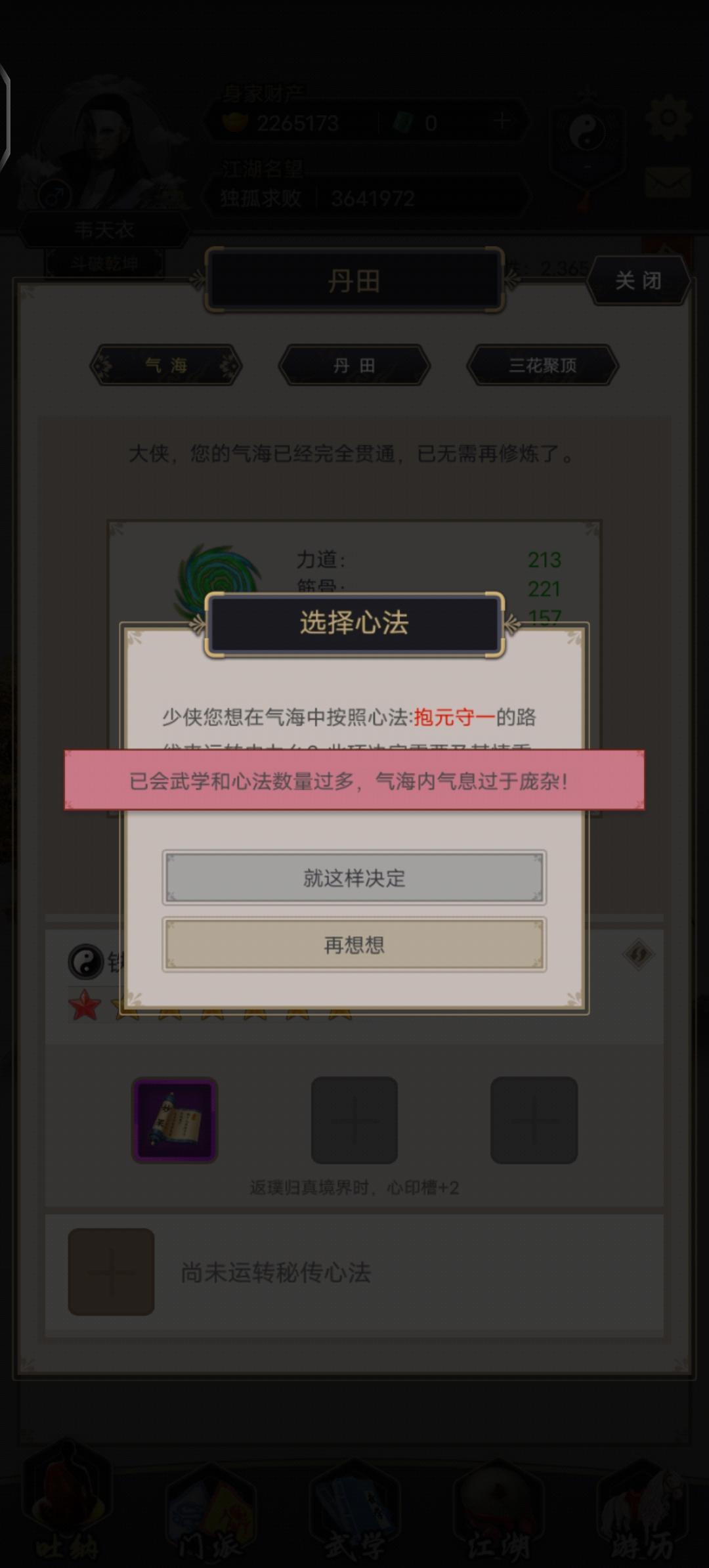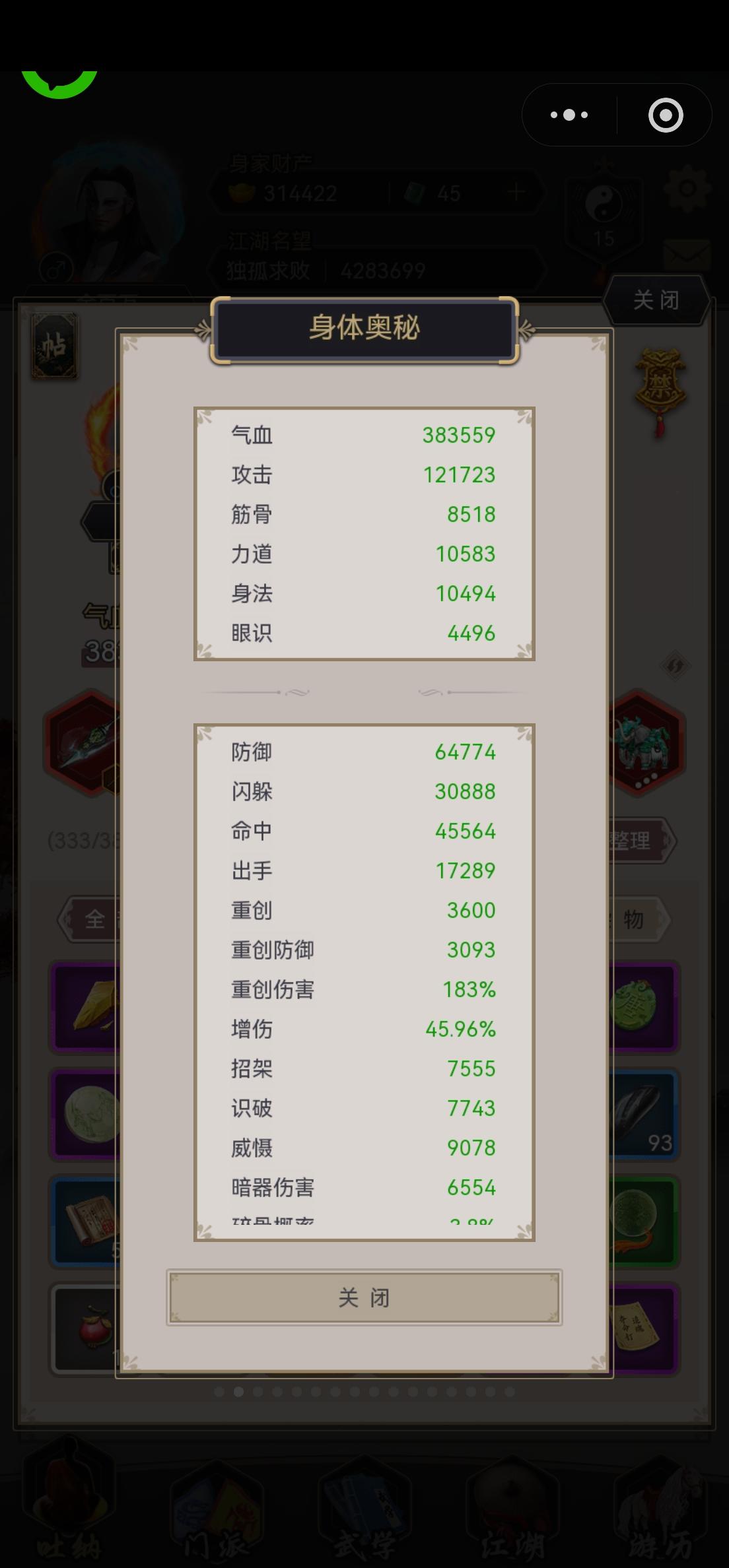 在大家长久的期待当中洗髓终于来了突破所需要的总和先放这里因为他还需要内力,所以简单概括我们需要1200洗髓(价值1200×6=7200w黄金)100固脉(价值800w黄金)三种丹药(价值396珍珠加一些道具)内力估计51w亿内力洗髓突破获得了多少属性呢???满级的话,加了5200的力道,筋骨,眼识,身法,加了1500暗劲,1200横练,好像还加了120十二经点