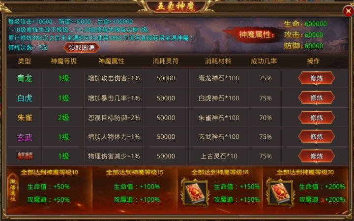 各位《远古传奇》的勇士们,今天给大家介绍的是五象神魔五象神魔可以提高基础属性以及神魔属性,全部升级到18以及20级还可以获得两个技能每修炼一级都可以增加10000攻击、10000防御、10000生命还有百分比的神魔属性可以增加,具体可以看下图,每等级增加1%全部等级达到10级:生命值以及攻魔道:+50%全部等级达到10级:生命值及攻魔道:+100%✔全部18级不仅能增加150%的生命值