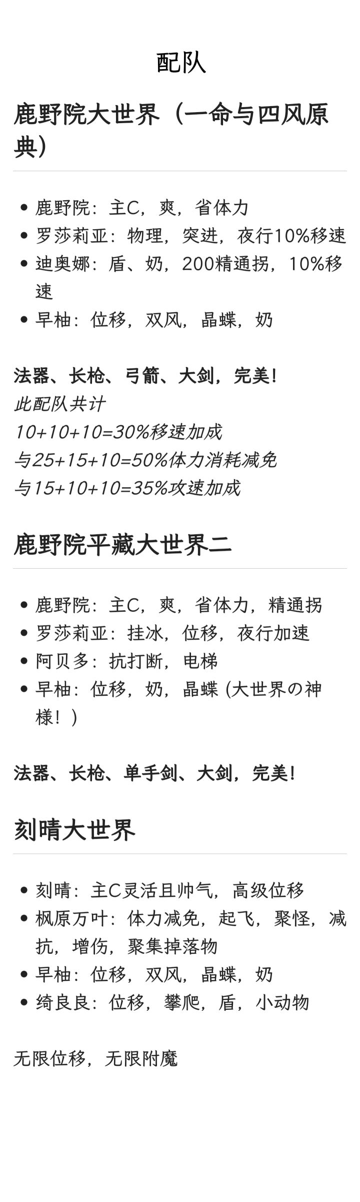如图,躺在笔记软件里很久了,心血来潮发一下————分割线————我的配队思路是,必带双风,形成近战主C+奶位+抗打断位的配置。角色尽量为战技启动,短轴或者高覆盖率。 因为楼主是强迫症,所以看不得血量没满,必带奶位;所以不喜欢出现重复武器类型,会尽量差异化。————分割线————最重要的一点:每位角色都最好拥有两条以上的大世界特质,例如体力减免(鹿野院 安柏)、材料收集(万叶 纳西妲 瑶瑶