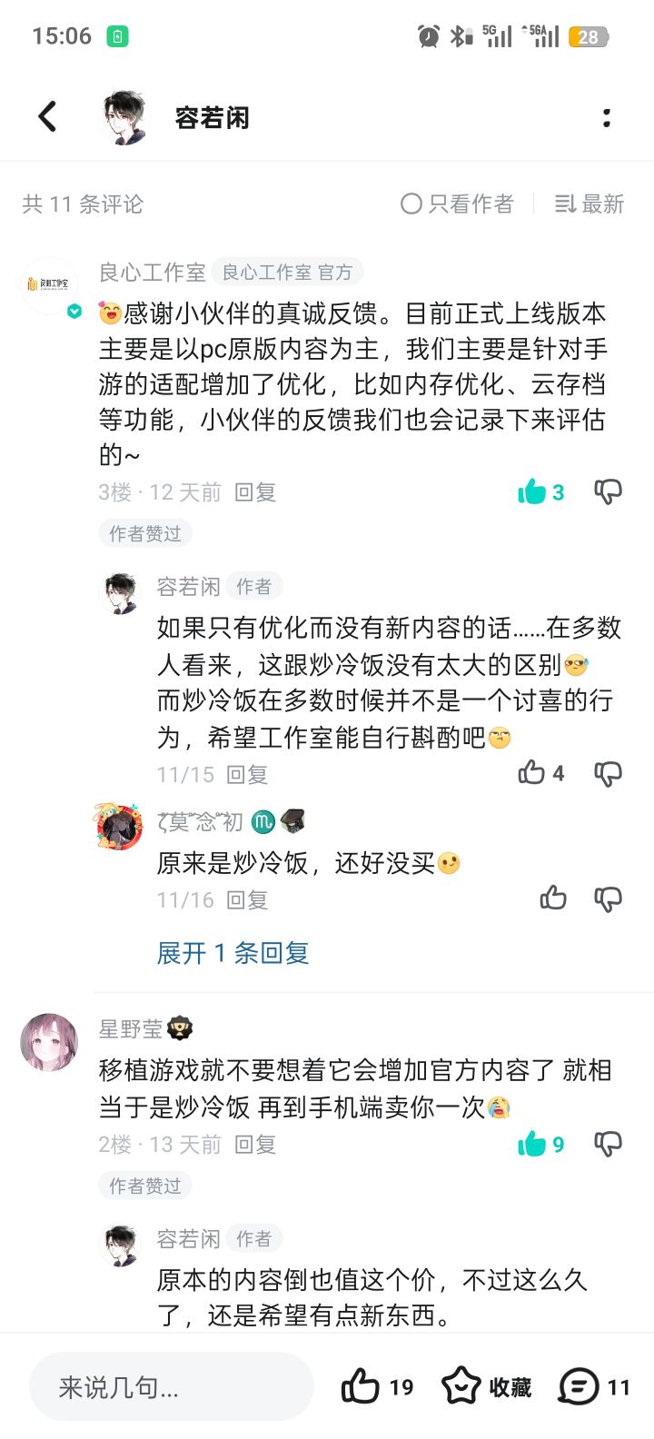 #游戏杂谈 简评:游戏还是那个味道,简单有趣,总体值得入手。而接下来是对工作室的吐槽:如图,官方的回复只有车轱辘话和画饼,看不到诚意。站在玩家的角度,这次的移植无法令人满意,最大而明显的问题就是没有新内容。只有一些小优化和调整,吸引力不足。加之游戏的手机版早有流出,不少玩家已经体验过大部分内容。这使得游戏的正版没有很强的竞争力。希望工作室好好考虑接下来的行动,别让游戏凉掉