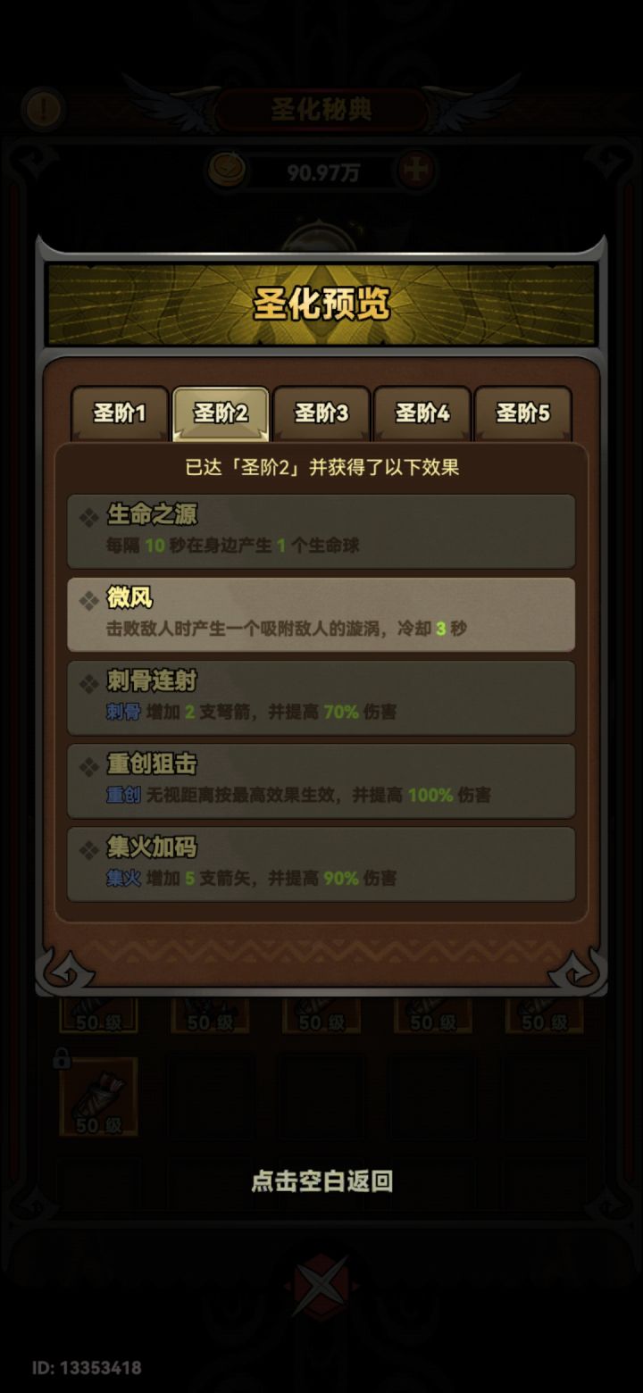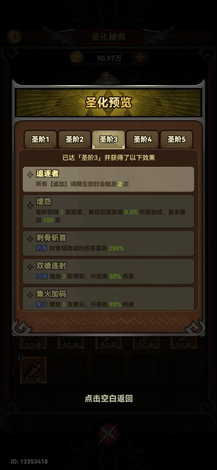 圣化太费资源了,出来讲两句。1、[微风]在行宫<阵风>出来前,推图效率不错。4集火1微风,有了就留着用。(91速刷或竞速)2、[追逐者]是冲层打boss的好技能,4集火1追逐,有了也留着。(微风+追逐者=冲层搭档)3、圣化5集火,推测后期竞速用,5集火也留着。(125速刷或竞速)4、为便于套装切换,最好圣化主武:猎魔之弦(其次持鸣魔弓)以上差不多就留着,用不着先扔仓库,圣化这么贵,分解