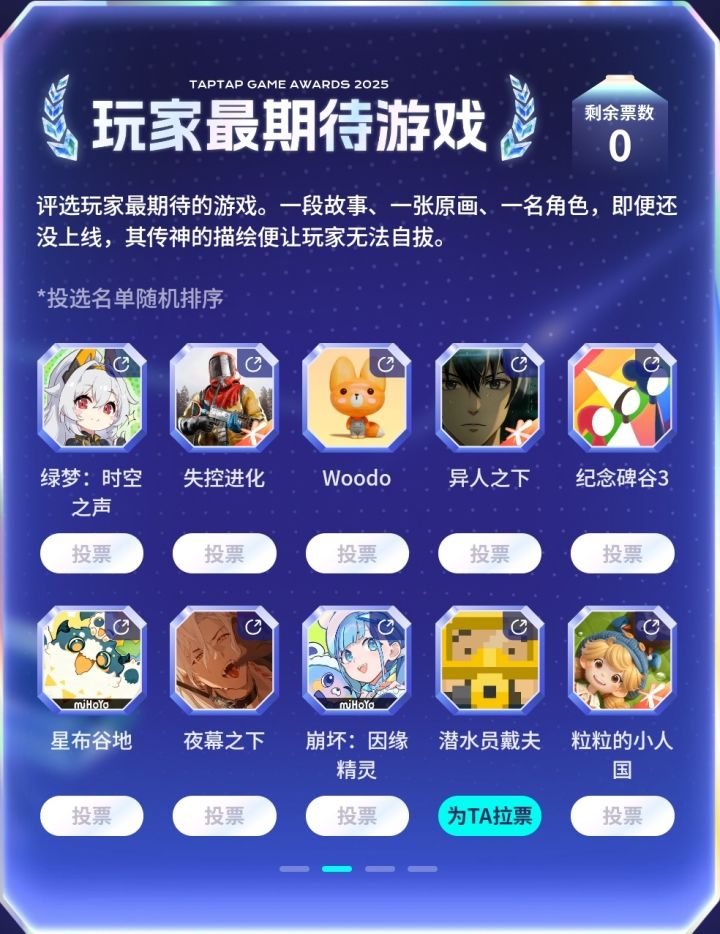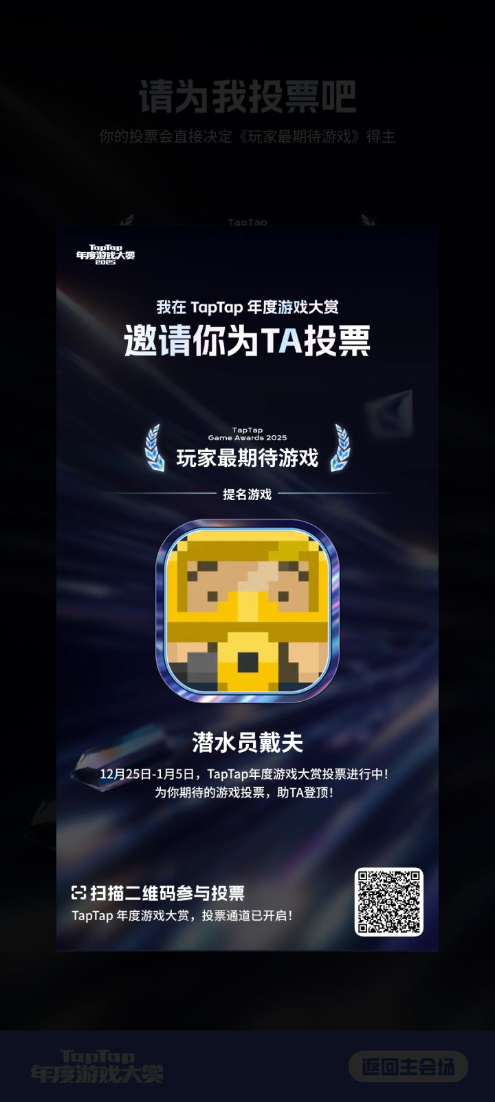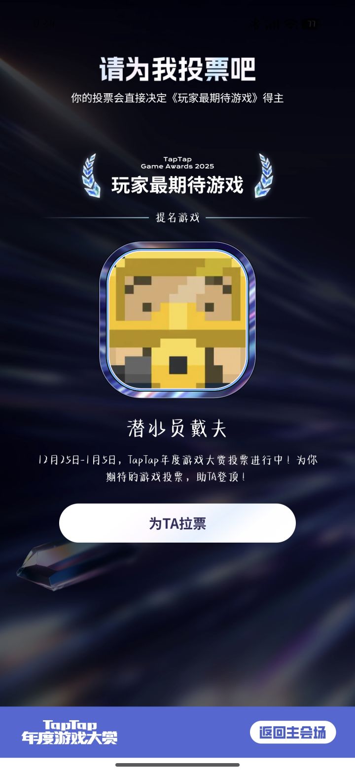 各位潜水员,今天收获满满了吗?!🐬今天,TapTap年度游戏大赏2025公布了各奖项的入围名单。《潜水员戴夫》晋级入围了“玩家最期待游戏”奖,获得了角逐最终奖项的资格。正是大家投出的每一票,将戴夫送上了这个舞台,感谢大家#送戴夫出道 !无论戴夫能否最终获奖,我们都准备了一点小心意,送给支持与鼓励戴夫的大家:1月24日,我们会在评论区抽30名潜水员,赠送《潜水员戴夫》的周边海洋盲卡*1。本帖