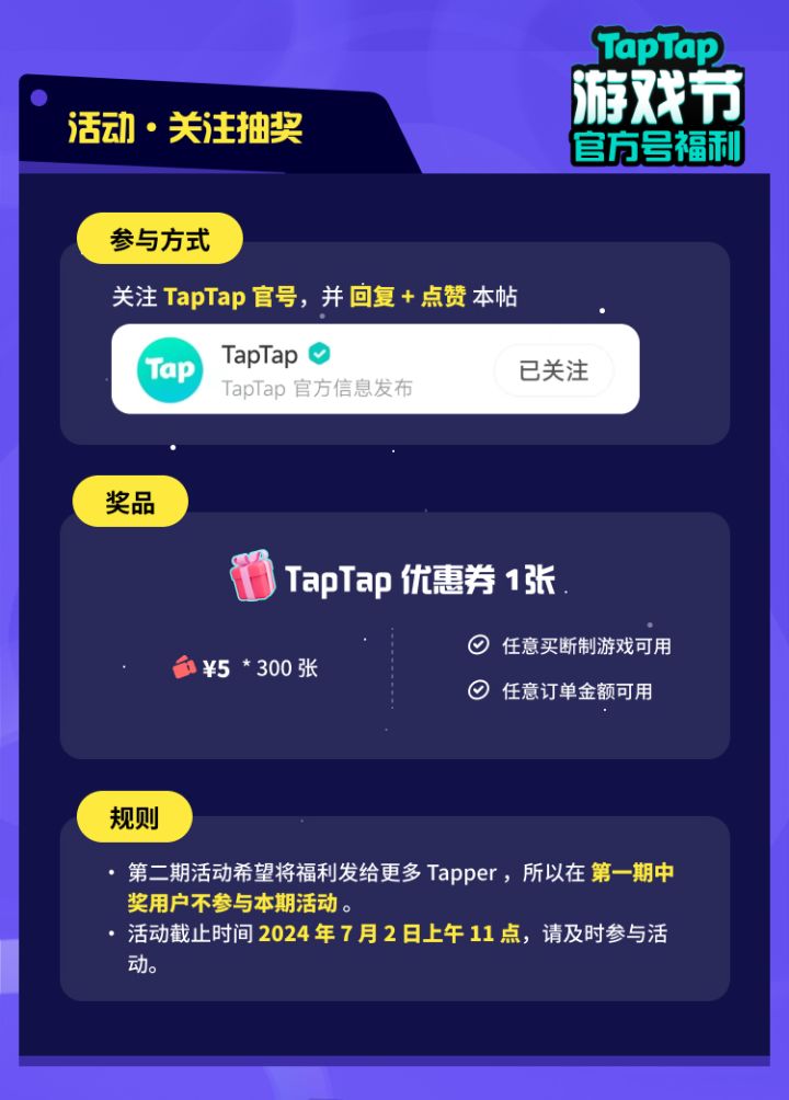 第一弹 TapTap 官方号活动已顺利结束,奖励也发出。但我掐指一算,活动预算还有剩余,那么这就继续给大家发福利吧~300 张 5 元券,TapTap 站内任意买断制游戏可用,关注 TapTap 官方号并回复 + 点赞即可参与抽奖 #TapTap游戏节 #送福利 #发现好游戏