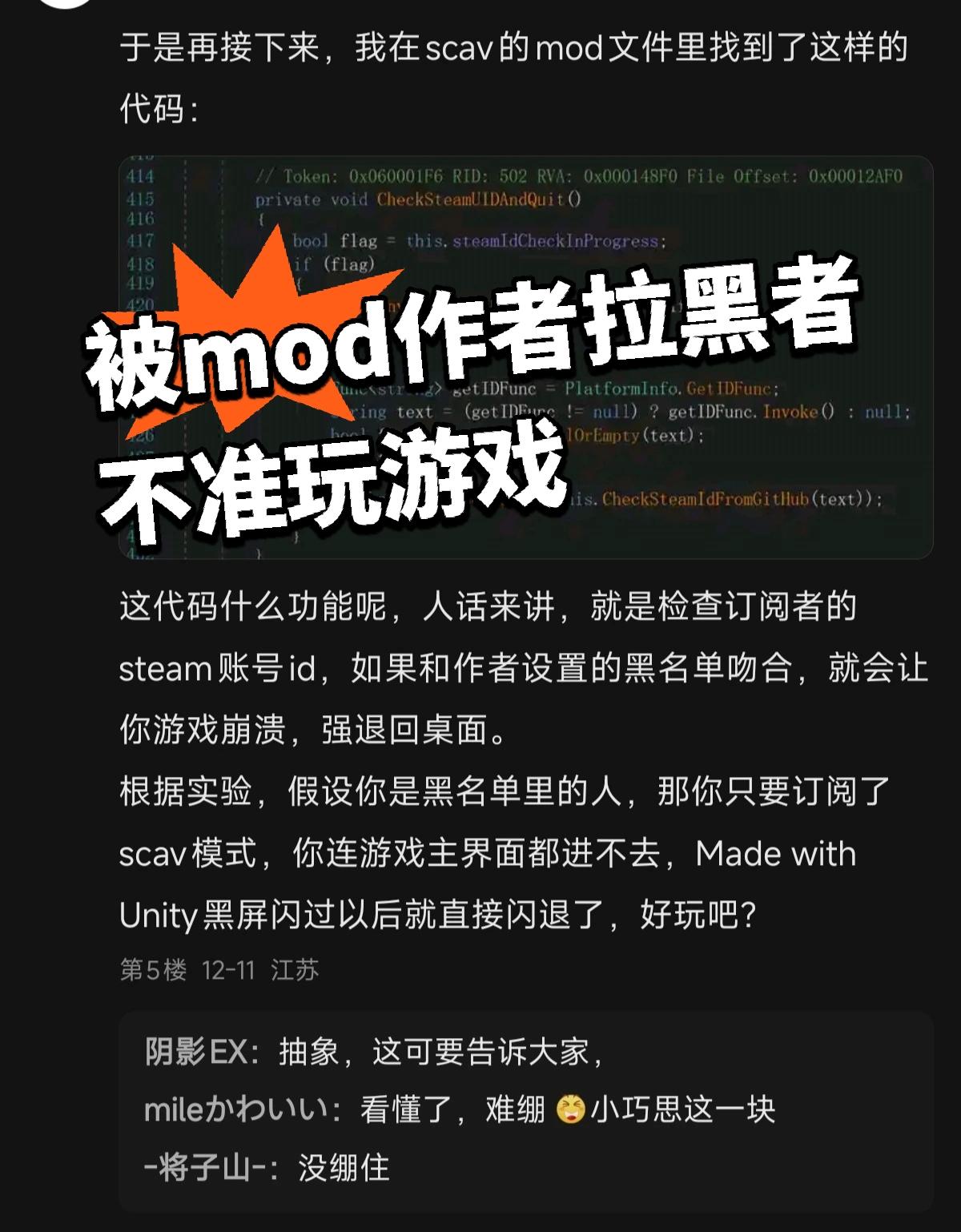 《逃离鸭科夫》Steam创意工坊知名MOD “SCAV” 近期引发争议,作者被指在MOD中植入恶意代码,被其拉黑名单的玩家使用该MOD时,会无任何提示直接闪退,行为堪称恶劣。按游戏MOD社区惯例,此类危害玩家体验的行为本应严肃封杀、以儆效尤,以此重塑玩家对官方和社区的信任。作为拥有处置能力的官方,本应重视并正面回应,但截至目前,《逃离鸭科夫》制作组未发布任何相关声明,仅流传出疑似制作方无底线讨好