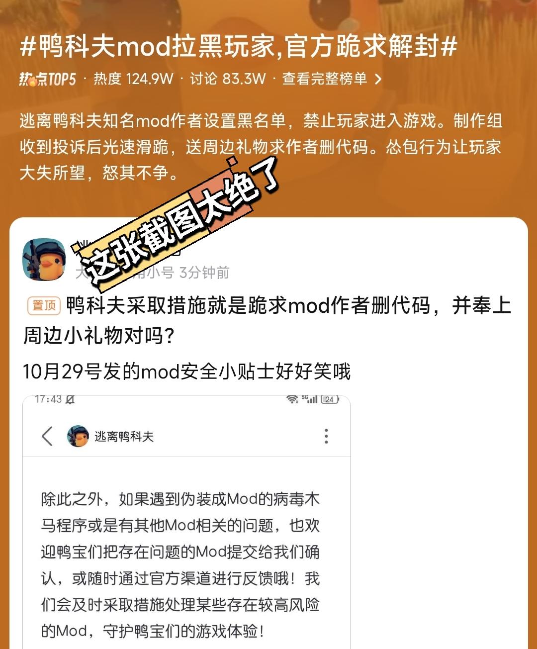 逃离鸭科夫知名mod作者设置黑名单,禁止玩家进入游戏。制作组收到投诉后光速滑跪,送周边礼物求作者删代码。怂包行为让玩家大失所望,怒其不争。官方这个操作太掉价了点,给人的感觉就是游戏官方惹不起mod作者但情况不应该是反过来的吗?希望官方后续硬气一点#主机单机 #游戏资讯 #国产单机 #独立游戏 #逃离鸭科夫