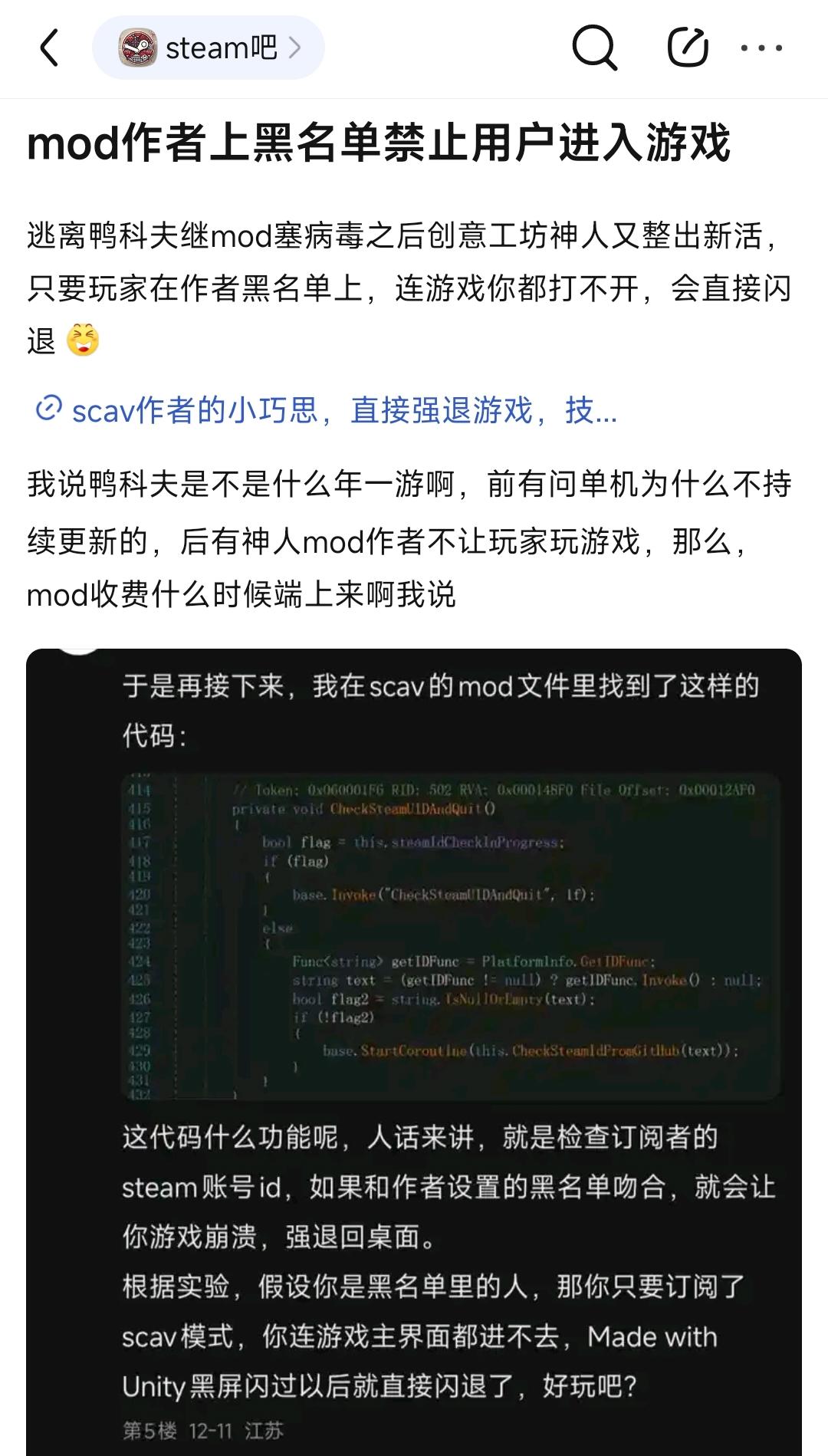国产射击游戏《逃离鸭科夫》官方在12月15号终于出来滑跪道歉了。 事情是这么回事,创意工坊里有个叫【Scav模式 1.8.0】的MOD,作者在里面藏了点脏东西(异常代码),被这作者拉黑的玩家会出现游戏直接强制闪退。一开始,网上传出来官方跟那MOD作者低声下气的沟通截图,说好的对恶意代码零容忍呢?这下好了,Steam上一下子多了500多个差评。现在官方出来发公告承认自己错了,说两大失误:一个是