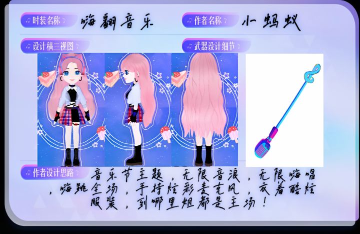 第二届时装设计开始有些时日了,这次的主题是无限音浪,听名字就和音乐有关,当时脑子里有很多想法,想找一个点,来对星辰少女莉安娜进行包装 想了几天,就从音符,音乐节这个点出发,于是就定好了大概主题,既要潮流感,又要现代感,整个电玩城被包裹了缤纷生动,红蓝交替的色彩,当时就定下了颜色主体,红蓝搭配;以及圣女的武器,想到是音乐节,之前她的武器多是法杖,想到圣女要站就站C位,