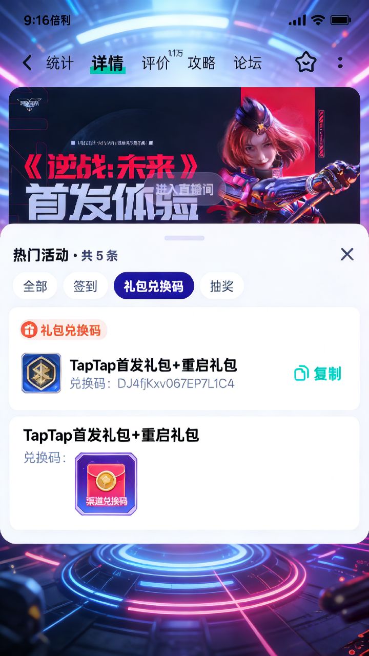 标题:《逆战:未来》TapTap福利码兑换保姆级教学 玩家ID:422467630684624 TapID:11455054 内容: 各位《逆战:未来》的玩家们,TapTap渠道服专属福利码来了!今天我就手把手教你怎么把这些白嫖福利领到手,全程合规不踩坑!1. 打开TapTap,找到游戏页面 打开TapTap APP,在搜索栏输入“逆战:未来”,进入游戏详情页。 2. 进入福利中心,找到礼包
