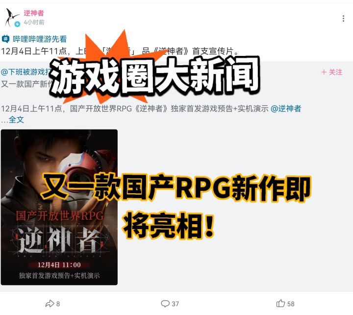明天12月4日上午11点,新游国产开放世界RPG《逆神者》将独家首发游戏预告+实机演示,对这个游戏类型感兴趣的游友可以去蹲一下官方哦。#主机单机 #pc主机掌机 #游戏讨论 #游戏资讯 #游戏种草计划 #今天游戏圈发生了啥