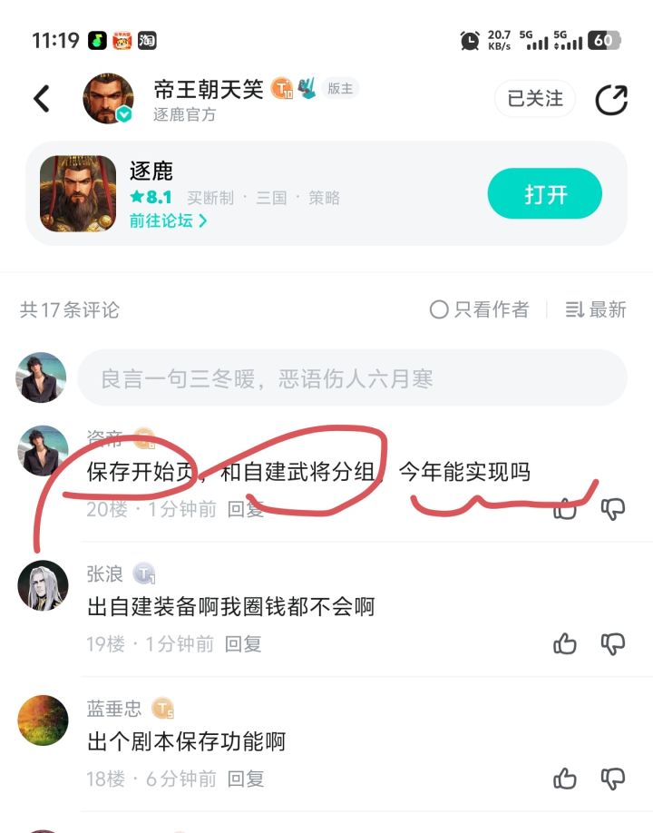 自建好剧本后,保留在开始页。这样以后可以换着势力玩,不要选了以后,就只能默认这个君主,这样太局限了。导致后面想换个势力玩,要重新自建导入剧本,太麻烦了。这个功能你真的要打开啊,老帝!!别担心会干扰你卖剧本。这个功能你要给的话,比如我加入了dlc武将,别人想玩,必须要买官方剧本才能导入玩,间接把你所有剧本销量都提起来,还能吸引更多的玩家来玩。你精力有限,这次更新足足等了20天,这20天我自建剧