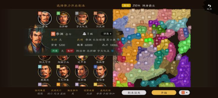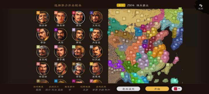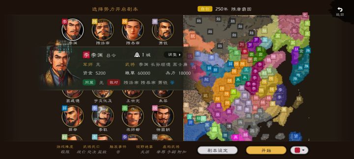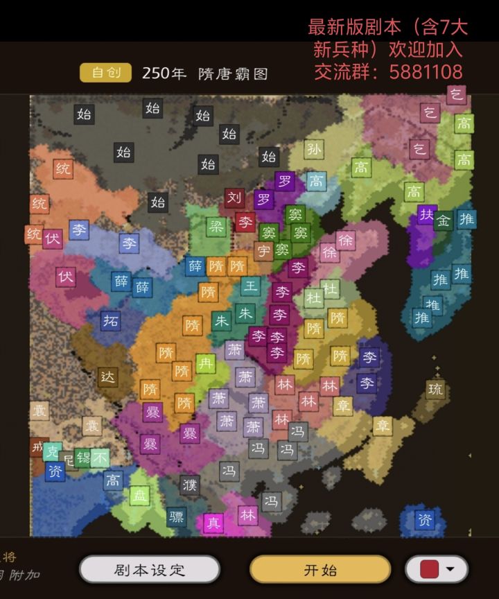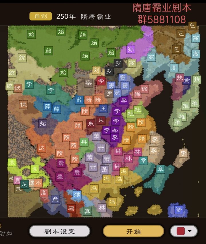 【隋唐霸业】资帝地图版·史实武将剧本经过一个多月的沉淀,捏出了自己的地图,再也不必被人诟病,同时打磨了武将四维数值(不会出现秦桧武力值100情况了。此剧本我会分享给之前支持过我的朋友。【剧本背景】隋末时期,由于隋炀帝的过度征敛和统治失策,导致社会动荡,冺不聊生,最终引发了大规模的农民起议和地方割据势力的形成。【主人翁】此剧本李渊-晋阳单城开局!让我们推翻隋朝暴政,开创大唐盛世吧!【剧本