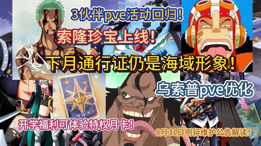 下月通行证仍是海域形象!索隆珍宝上线!乌索普pve优化,开学福利可体验特权月卡!3伙伴pve活动回归!【航海王热血航线】8月31日例行维护公告解读!资源副本调整!