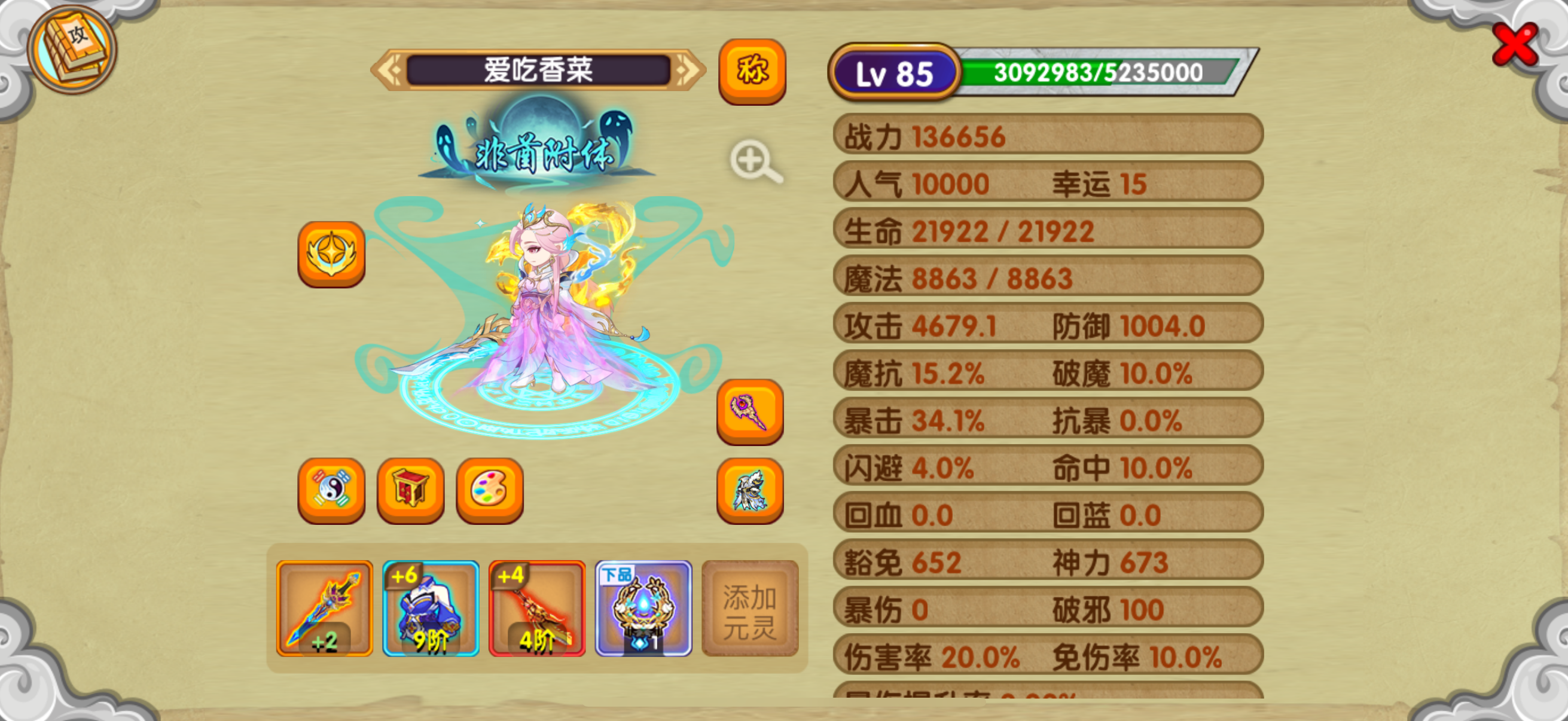 这个小号打到50级就一直放着没玩,想搞个8极北了,所以打算开练!先去二郎神刷个山河图(加暴击挺高的)强化+4或者+5都可以 先在龙宫一开双倍经验丹刷到75级,解锁炼狱 在炼狱诛仙峰拿到利·诛仙剑,进阶升级(一般来说五阶或者7阶前期就可以了)成长率洗到3.0以上金,或者2. 0以上也够用。去仙盟祭坛问仙(加属性嘎嘎猛)#造梦西游ol 攒仙气,买点悟空或者沙僧的魔王武力道具,准备后面用悟空或者沙僧的