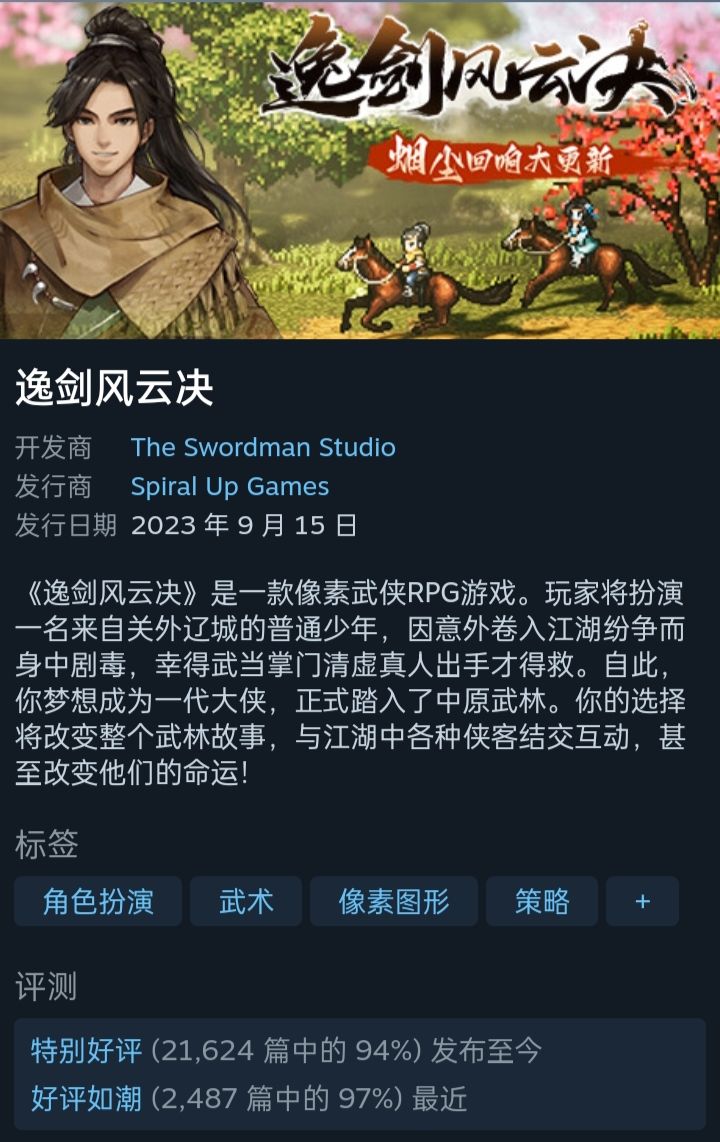 Steam高分移植!近3w条评论,94%好评!国产武侠rpg游戏的标杆之作!王道冒险剧情,满足你的武侠梦!海量支线设计,超多不同结局等你解锁!#游戏冒险家大集结 #逸剑风云决 #游戏推荐 #游戏安利