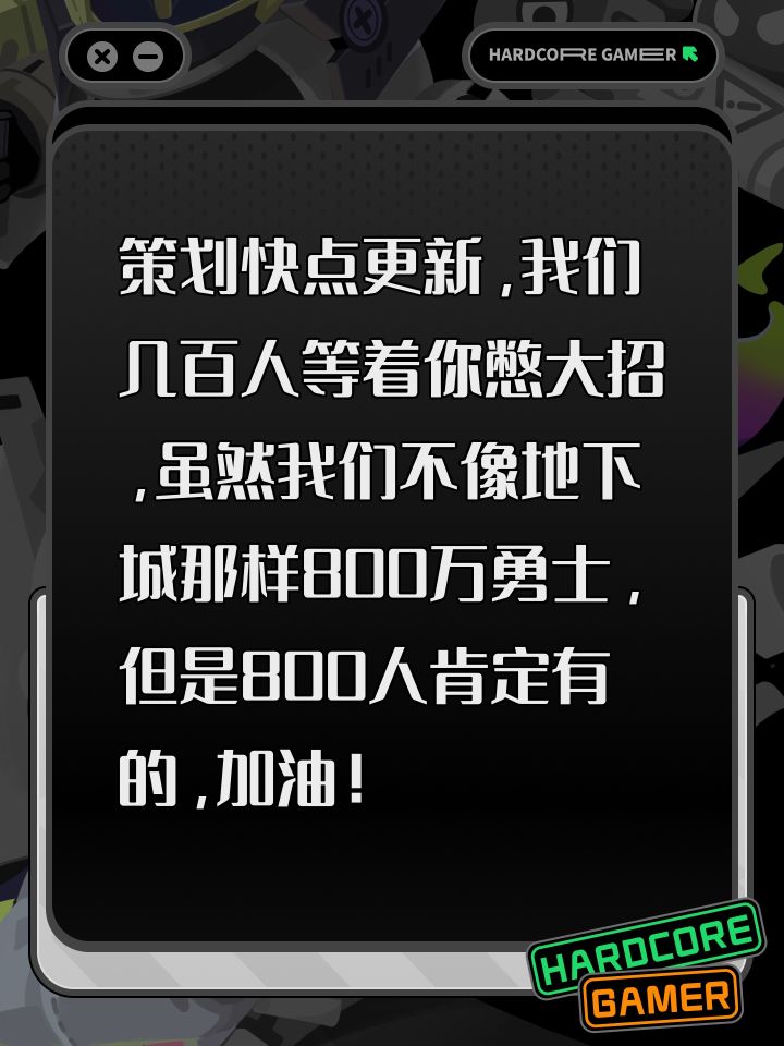 策划快点更新,我们几百人等着你憋大招,虽然我们不像地下城那样800万勇士,但是800人肯定有的,加油!#遗迹旅人 #遗迹旅人攻略征集活动 #遗迹旅人公测 #遗迹旅人传说的地下城