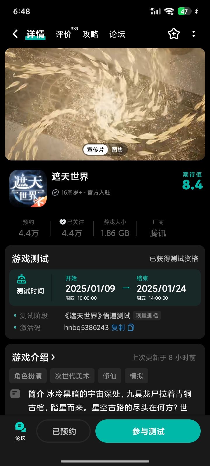 🔥辰东小说《遮天》正版授权改编的国风修仙手游《遮天世界》限量测试来啦!👉游戏忠于原著的世界观,高度还原经典剧情。在久远的纪元中传说的“仙”逐渐揭下神秘面纱...作为圣体凡人,如何一路问鼎圣域?✅探秘东荒——自由探索 天缘奇遇✅帝路之争——神器法刃 助力飞升✅问鼎圣城——仙门对战 实力为尊✅开山立派——荒塔历练 问道修仙💖资格获取方式,点击文末“参与测试”,然后下载游戏登陆注册角色,就能