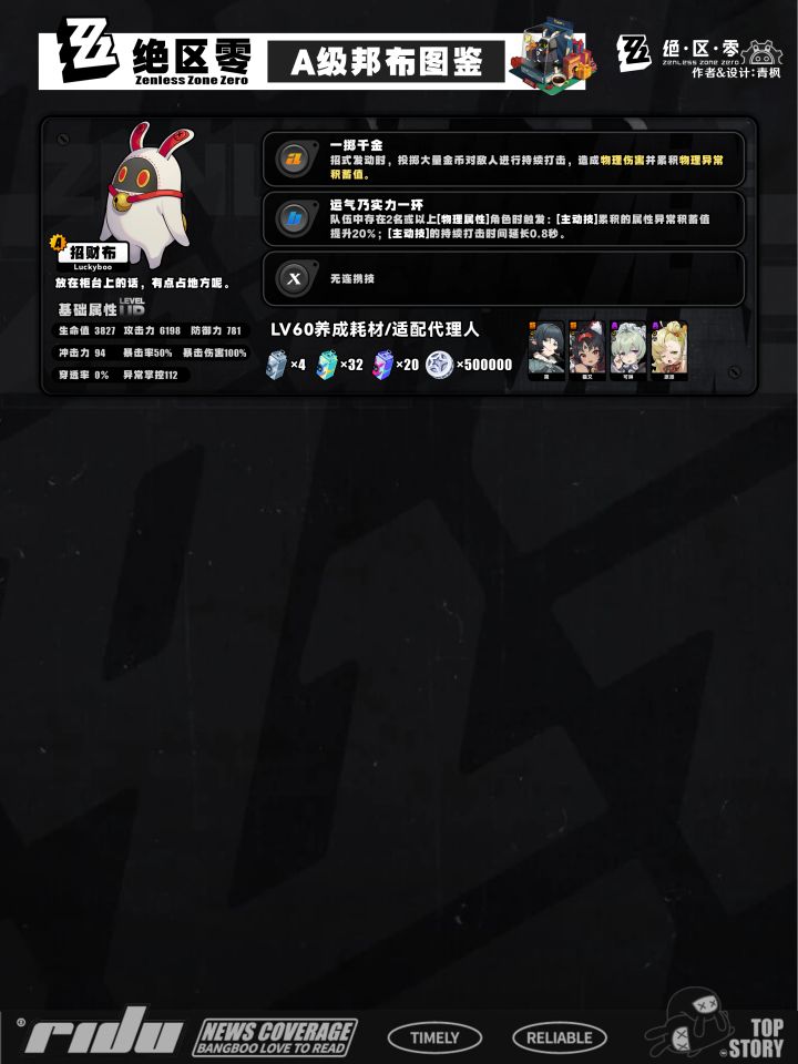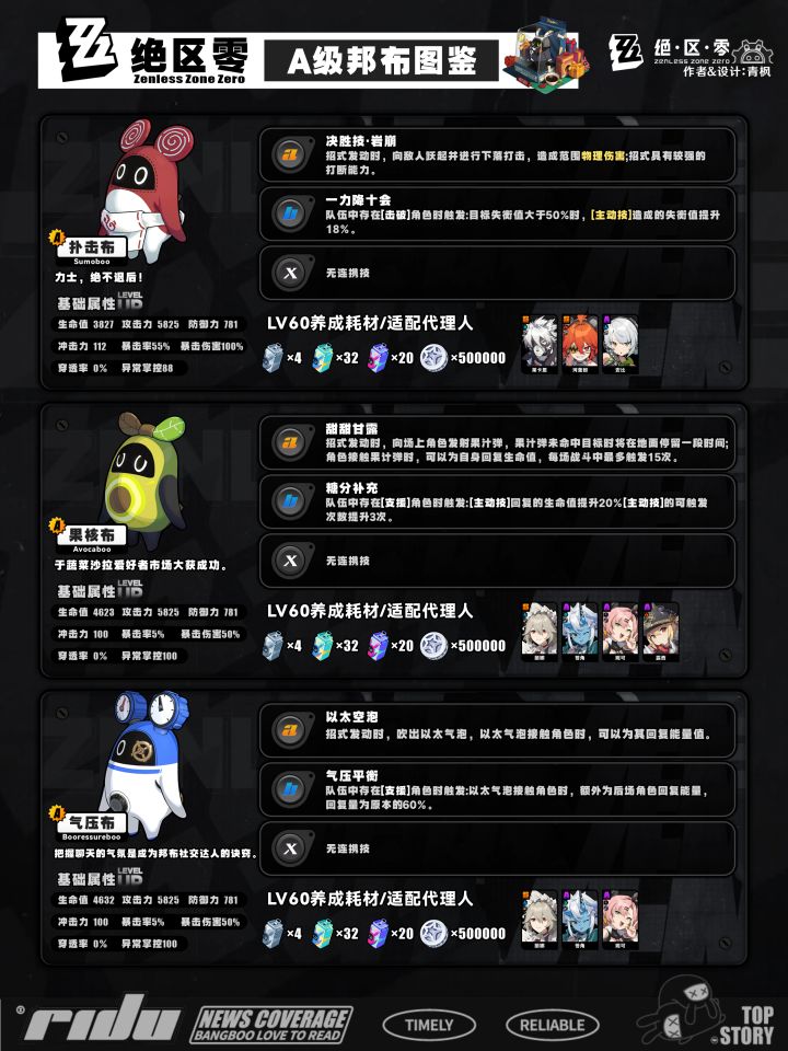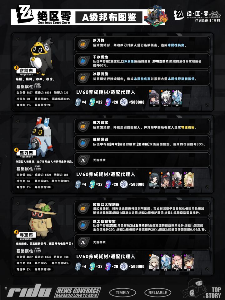 UID:10268057hi各位绳匠们大家早上中午晚上好呀,这里是为大家带来邦布攻略的青枫🧿Fairy:接下来以图鉴的形式,整理下当期1.2版本的所有邦布类型,包含各自效果及适配代理人建议;▌设定简介●背景设定中,邦布最初诞生的目的是为新艾利都的居民们提供空洞灾害预警以及避难指引,当区域内出现空洞灾害时,每台邦布会在第一时间从公用网络上获取灾害信息和避难指引,帮助附近人群躲避灾害;而现如