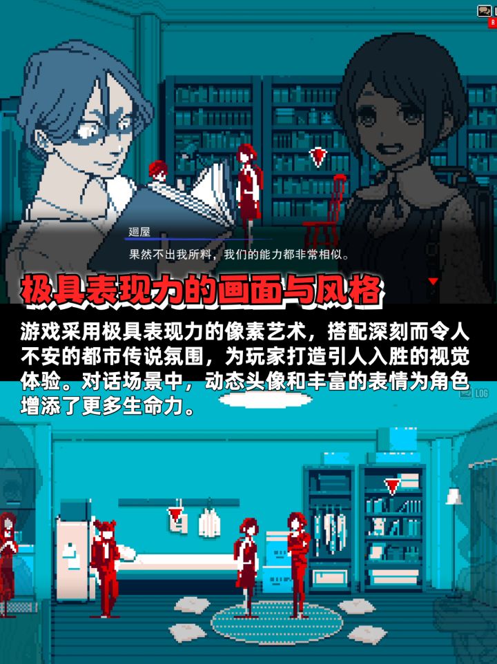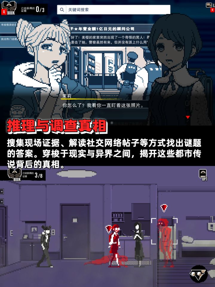《都市传说解体中心》是一款像素风格的悬疑冒险游戏,由 Hakababunko 开发、SHUEISHA GAMES 发行,于 2025 年 2 月 12 日正式发布。这款游戏的核心是解决围绕都市传说展开的各类谜题,涉及诅咒遗物、闹鬼租屋和维度异常等超自然现象。玩家将化身女主人公“福来蓟”,在都市传说解体中心主任兼 S 级灵能者“廻屋”的指导下,破解各种扑朔迷离的案件。游戏特色:1. 故事背景玩