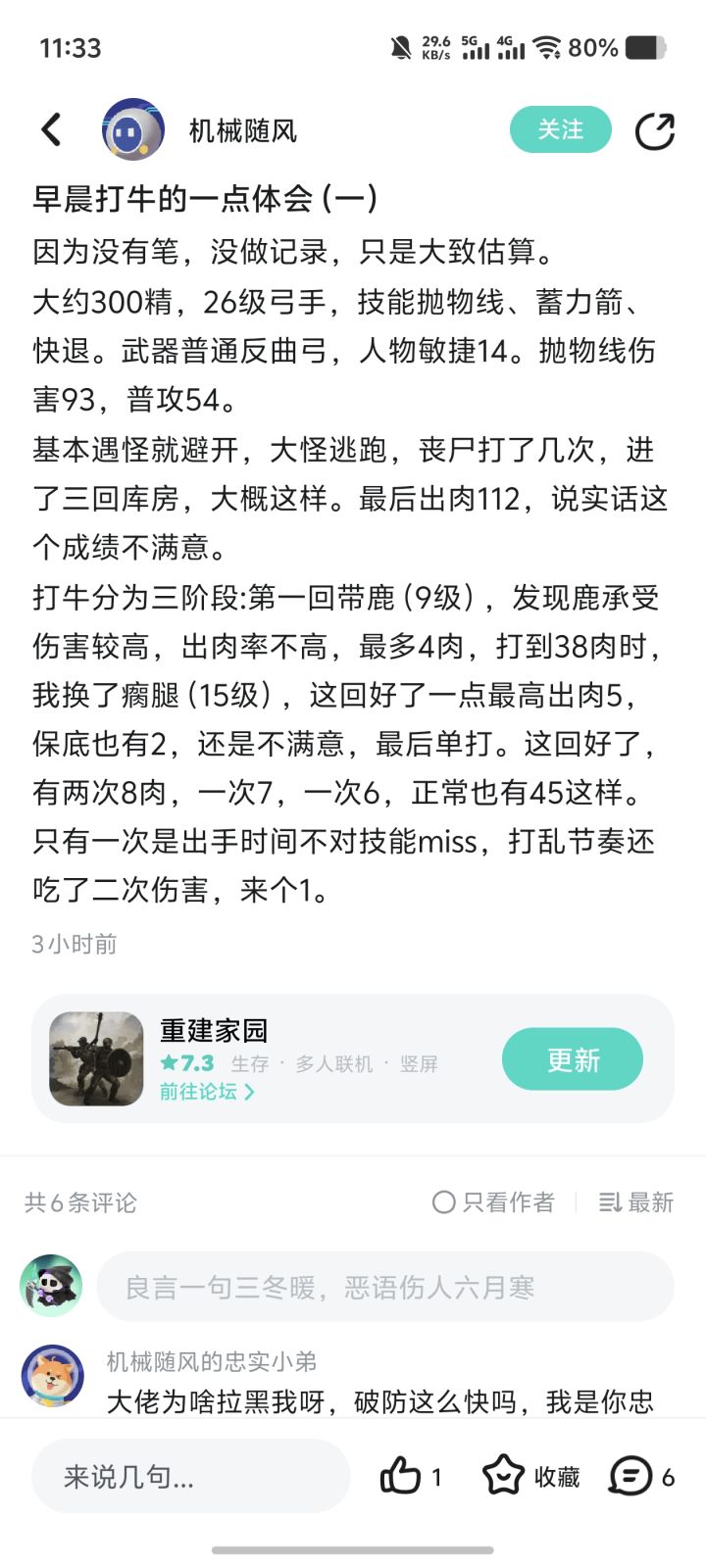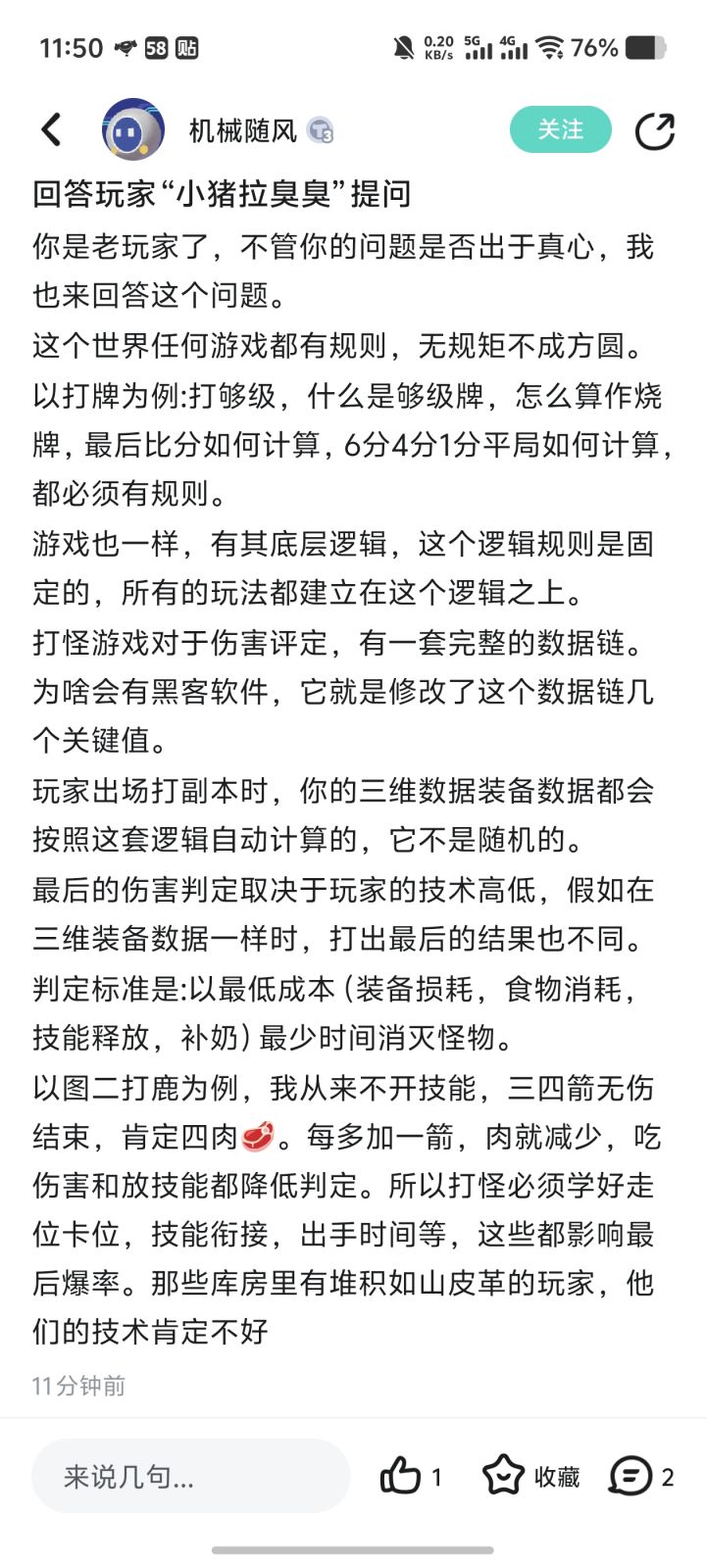 在外面一顿评论下终于还是忍不住为我出了个帖子p1是挂我的,p2开始是机械随风大佬的各种攻略帖子虽然删掉了,不过还是被我截图了捏机械随风励志如下:1.誓要研究出打狼的掉肉落概率,肯定有一套是百分百掉落的,不过是你们出手时机不对2.要无伤单挑所有boos,你们不行不代表别人不行等发言(已删帖)3.研究摸索需要合理数据支撑,胡编乱造纯乐子4.希望机械随风大佬可以尽快过便利店#重建家园万圣节