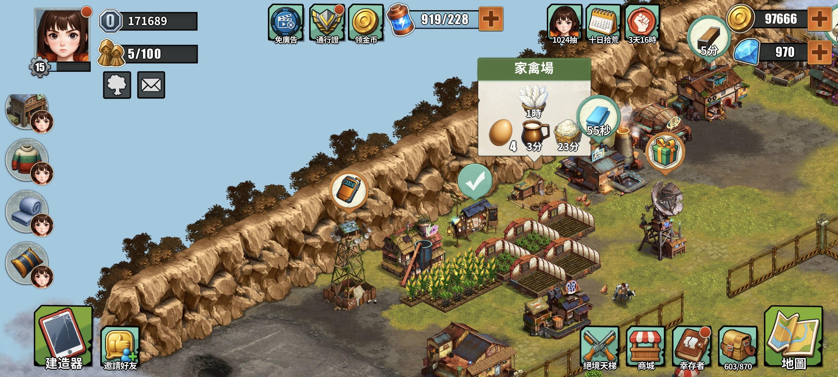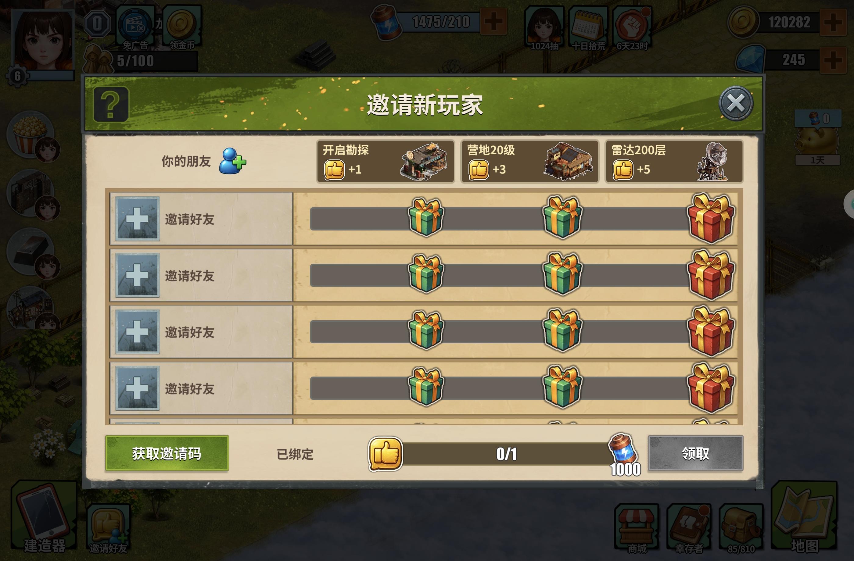 免广告已买,长期玩,互填邀请码领奖励376218 #发现好游戏 #重建生存营地